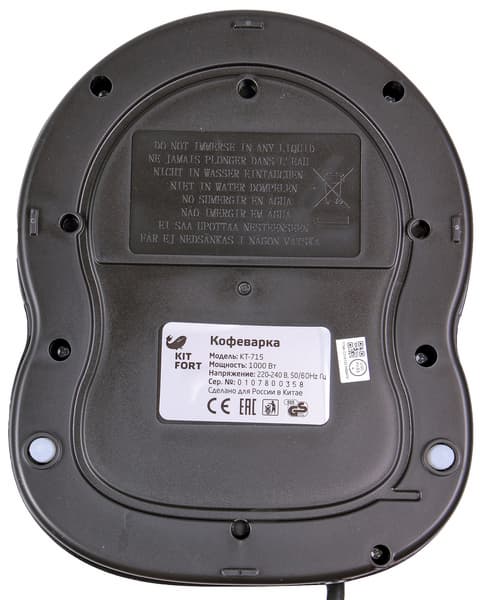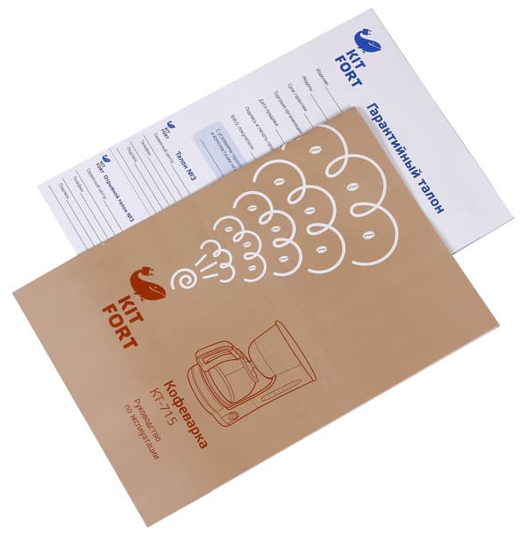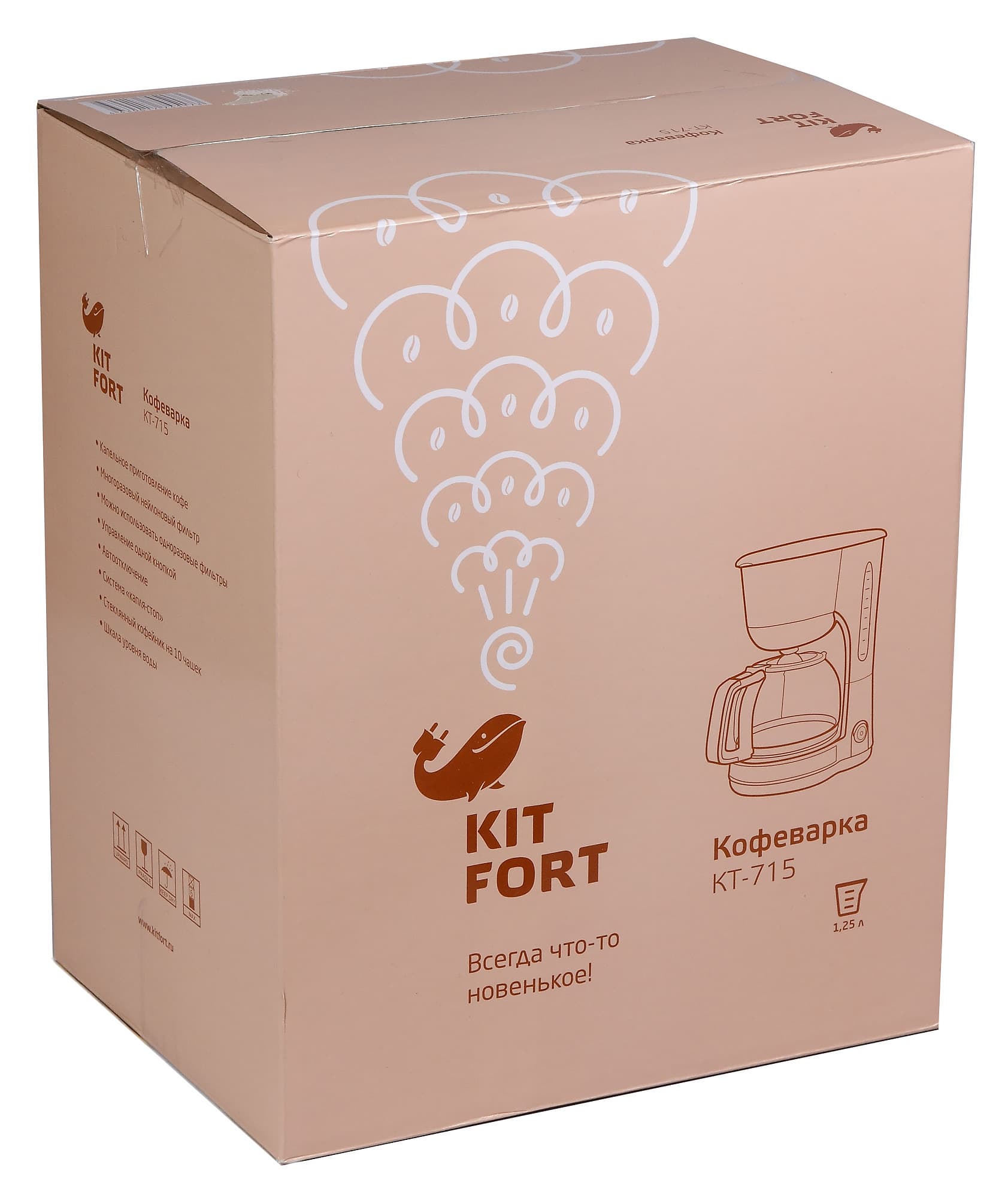 Кофеварка поставляется в коробке из гофрированного картона, оформленной в «кофейных» тонах (точно так же выглядят и коробки от других кофеварок, выпущенных под брендом Kitfort).