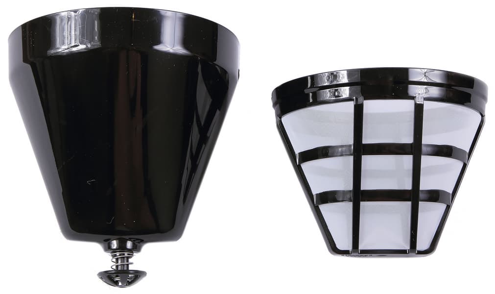 Отсек для заваривания кофе находится под той же крышкой. Состоит он из пластиковой воронки в сборе с антикапельным механизмом и многоразового нейлонового фильтра с ручкой, который при желании можно заменить на бумажный.