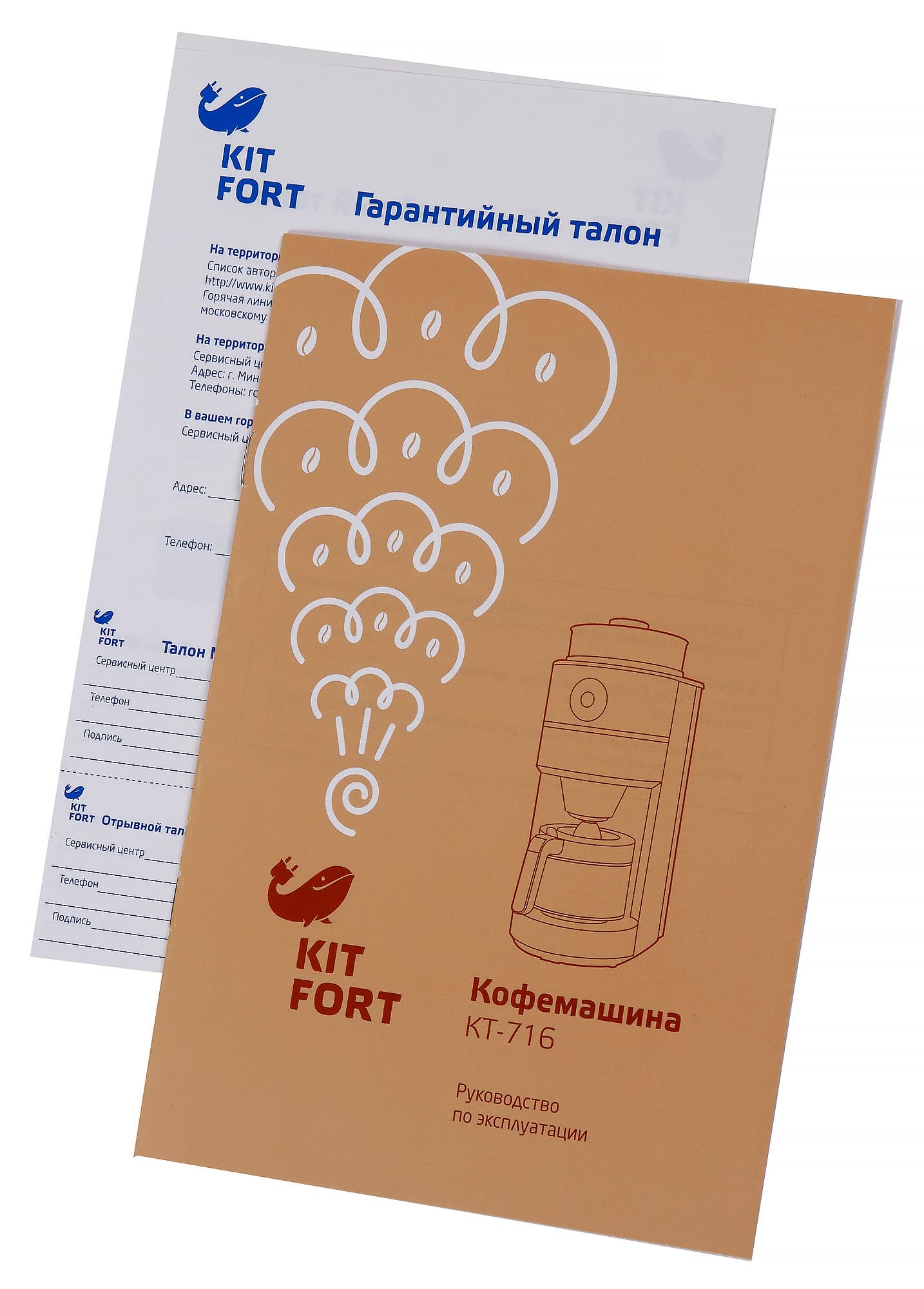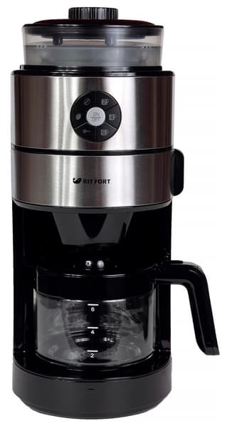 Недавно мы публиковали обзор капельной кофеварки Kitfort KT-715. Прибор, о котором пойдет речь в этот раз, отличается всего на одну цифру в номере модели, но стоит в четыре раза больше. Тут не кроется никакой сомнительной интриги, просто это аппарат со встроенной автоматической кофемолкой. Перемолотые зерна прибор отправляет в фильтр, после чего запускает процесс проливания порошка горячей водой. Это переводит устройство в ранг кофемашин — приборов, осуществляющих полный цикл варки кофе, от помола до получения порции напитка.
