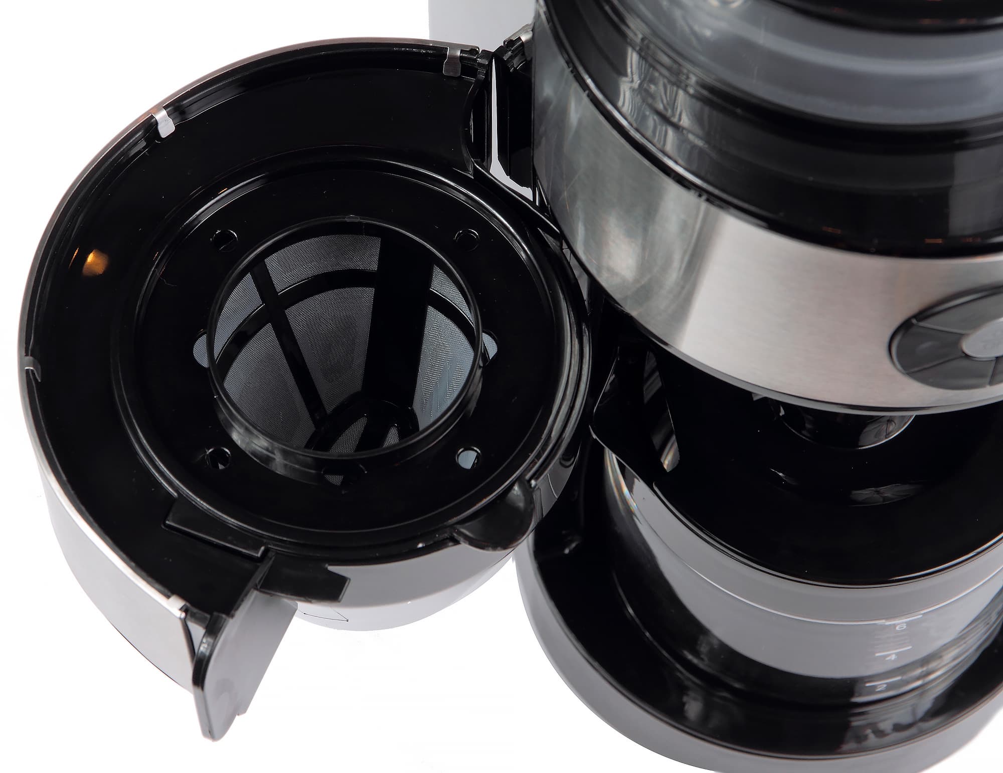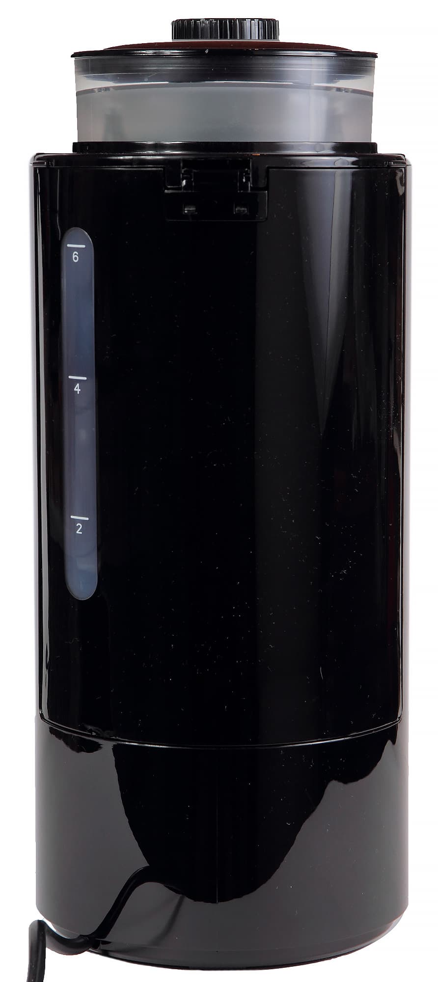 Кофеварка сделана из черного глянцевого пластика с металлическими вставками на корпусе. На наш субъективный вкус, внешне модель выглядит довольно приятно: простые округлые формы, спокойная цветовая гамма, нет лишних деталей или выбивающихся из сюжета элементов дизайна. Конечно, дополнительная функциональная часть конструкции (кофемолка) сказывается и на весе, и на размере прибора — но не критично. В масштабе кухни неискушенный наблюдатель вряд ли заметит разницу нашей модели с обычной капельной кофеваркой.