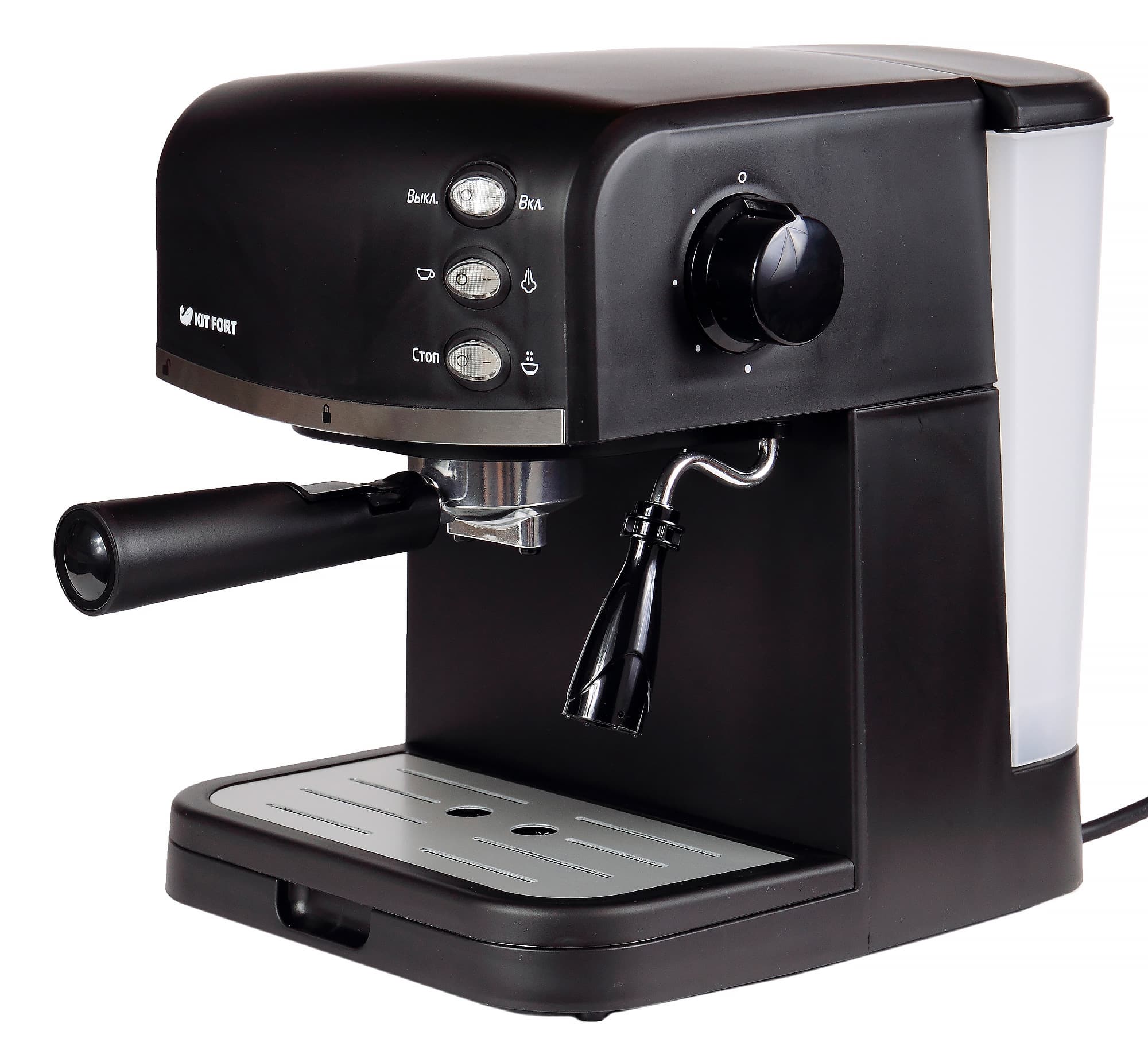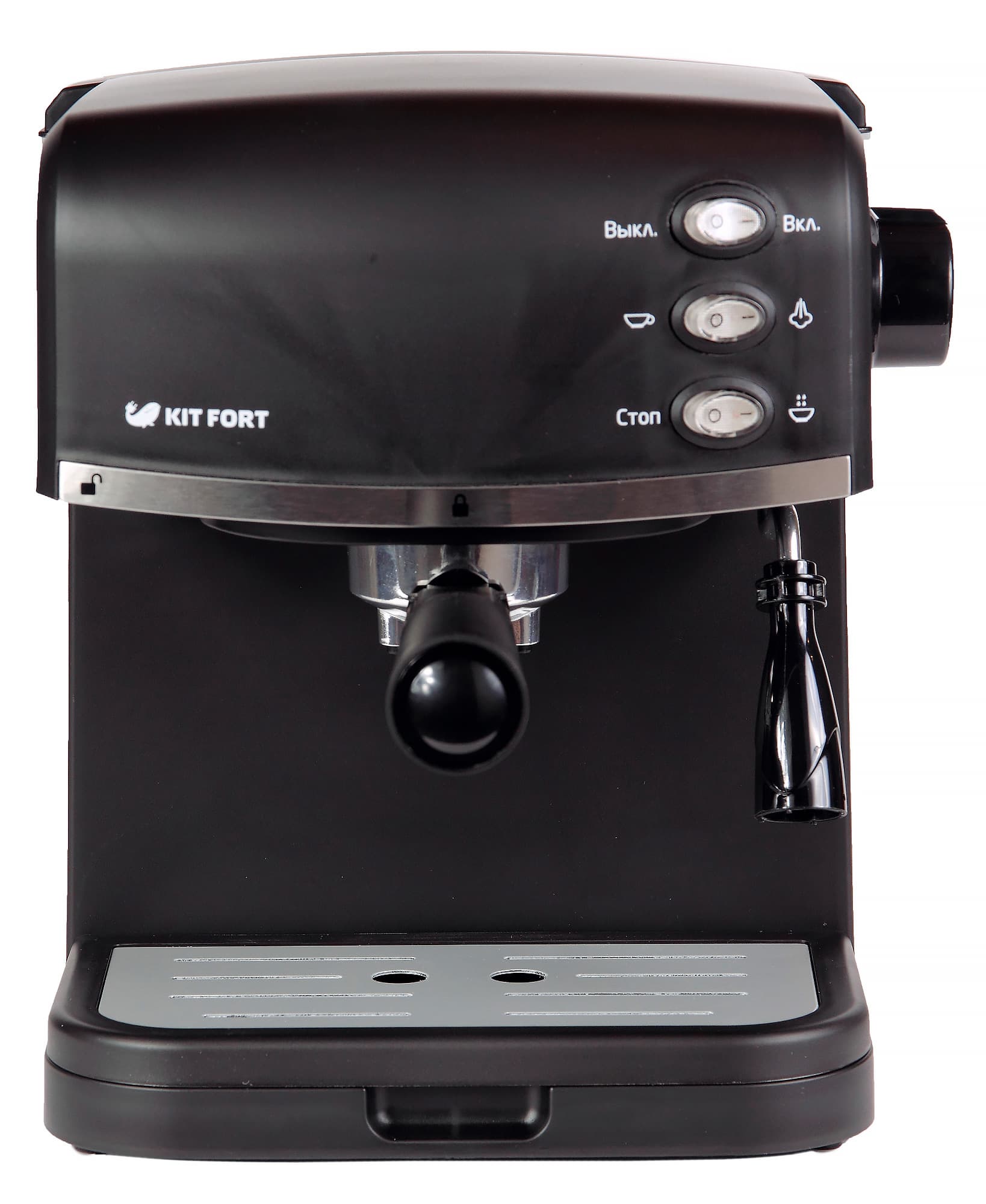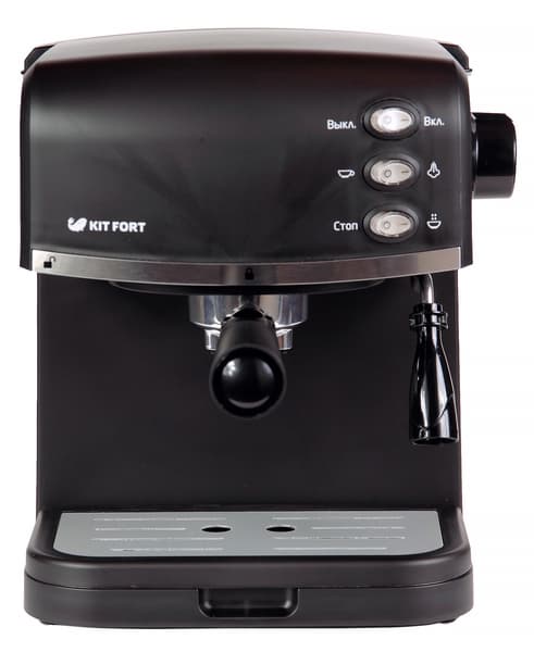 На передней панели кофеварки можно увидеть логотип Kitfort и три кнопки-переключателя, отвечающие за различный режимы работы прибора.