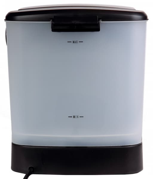 На контейнере нанесены метки, соответствующие минимальному и максимальному объему воды. Забор воды кофеваркой производится снизу, для чего в контейнере предусмотрен специальный подпружиненный запирающий клапан.
