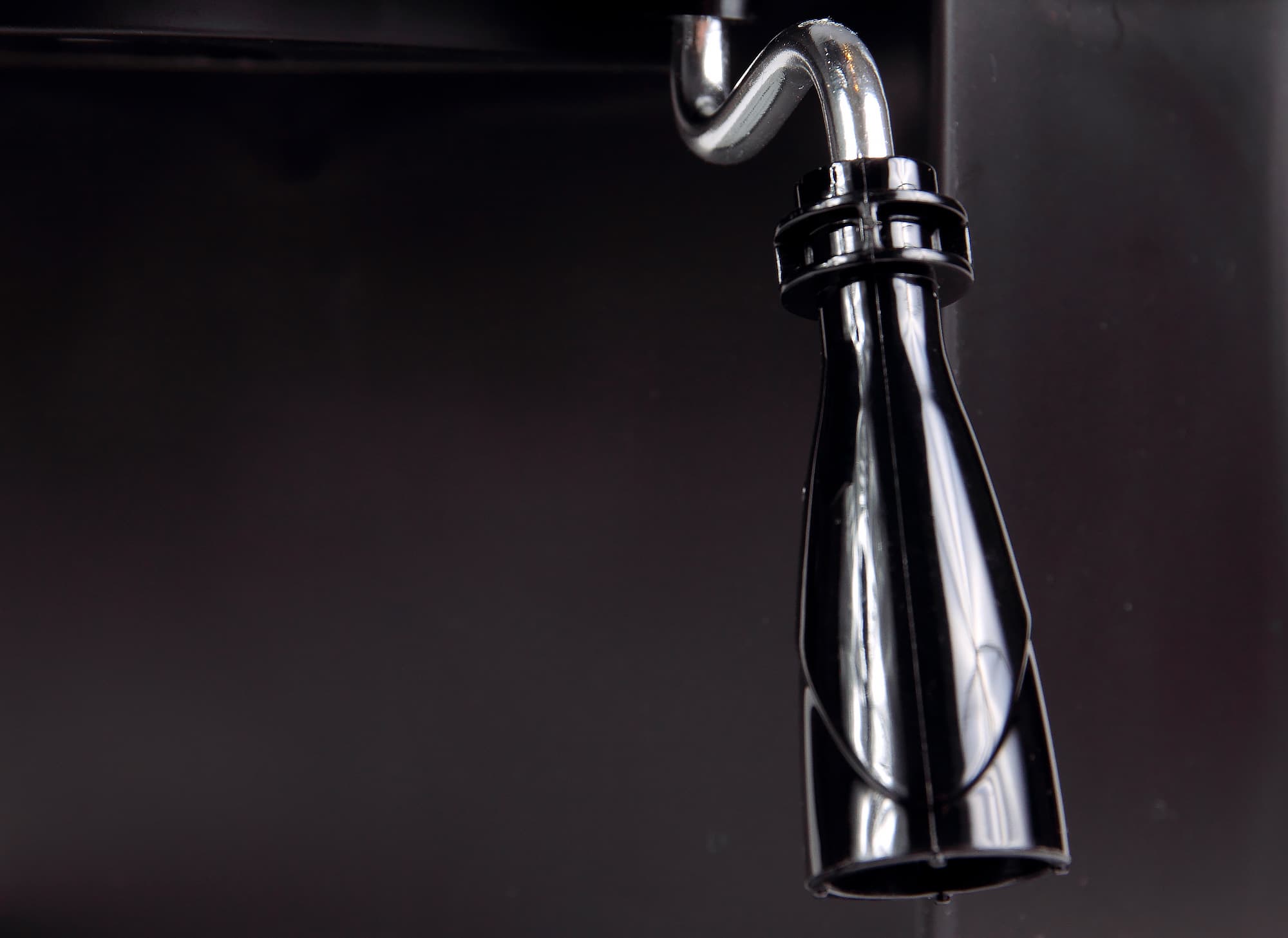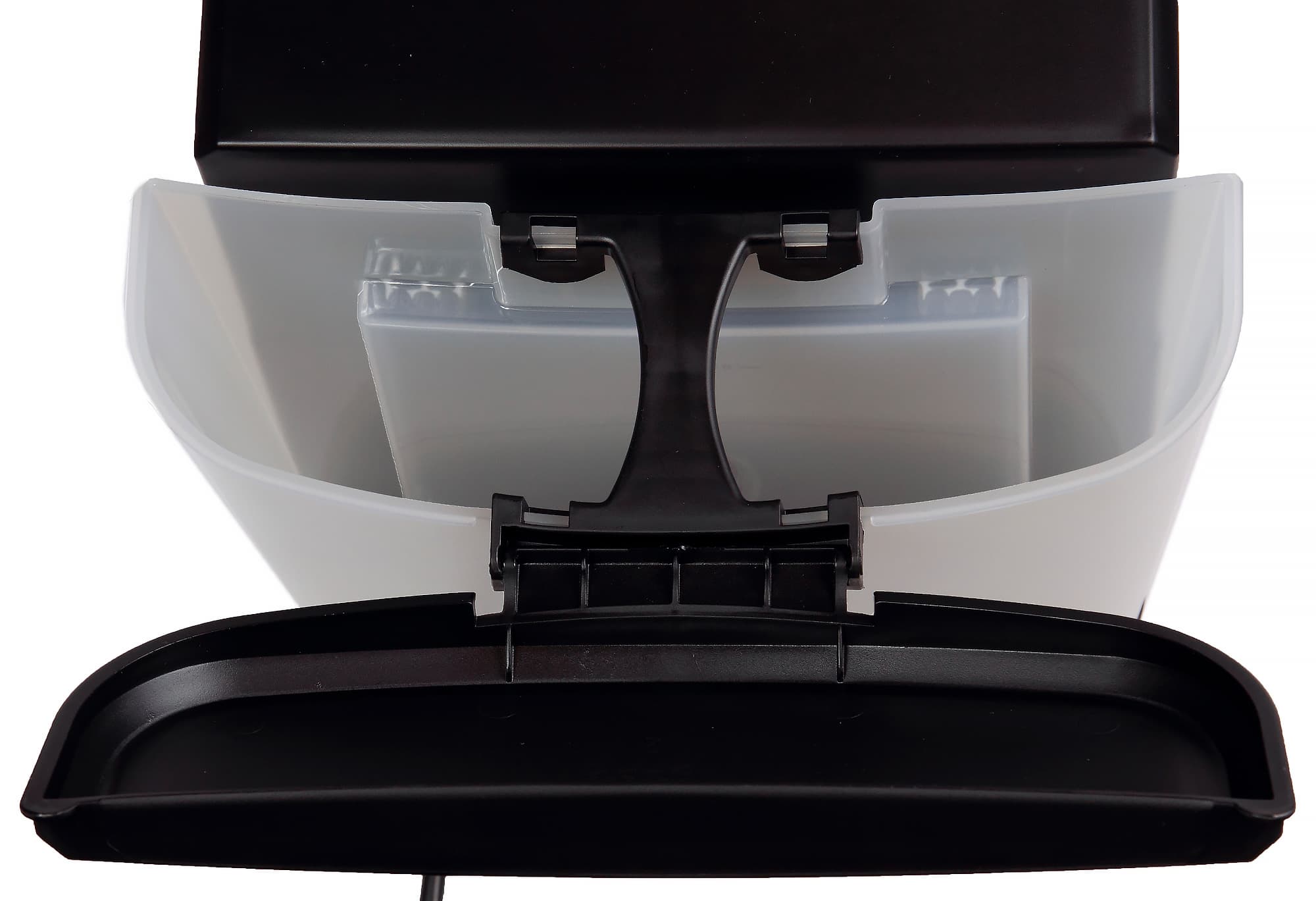 Под рожком располагается съемный пластиковый поддон для сбора капель и металлическая подставка для него. Индикатора переполнения в поддоне не предусмотрено, поэтому за уровнем жидкости придется следить самостоятельно.