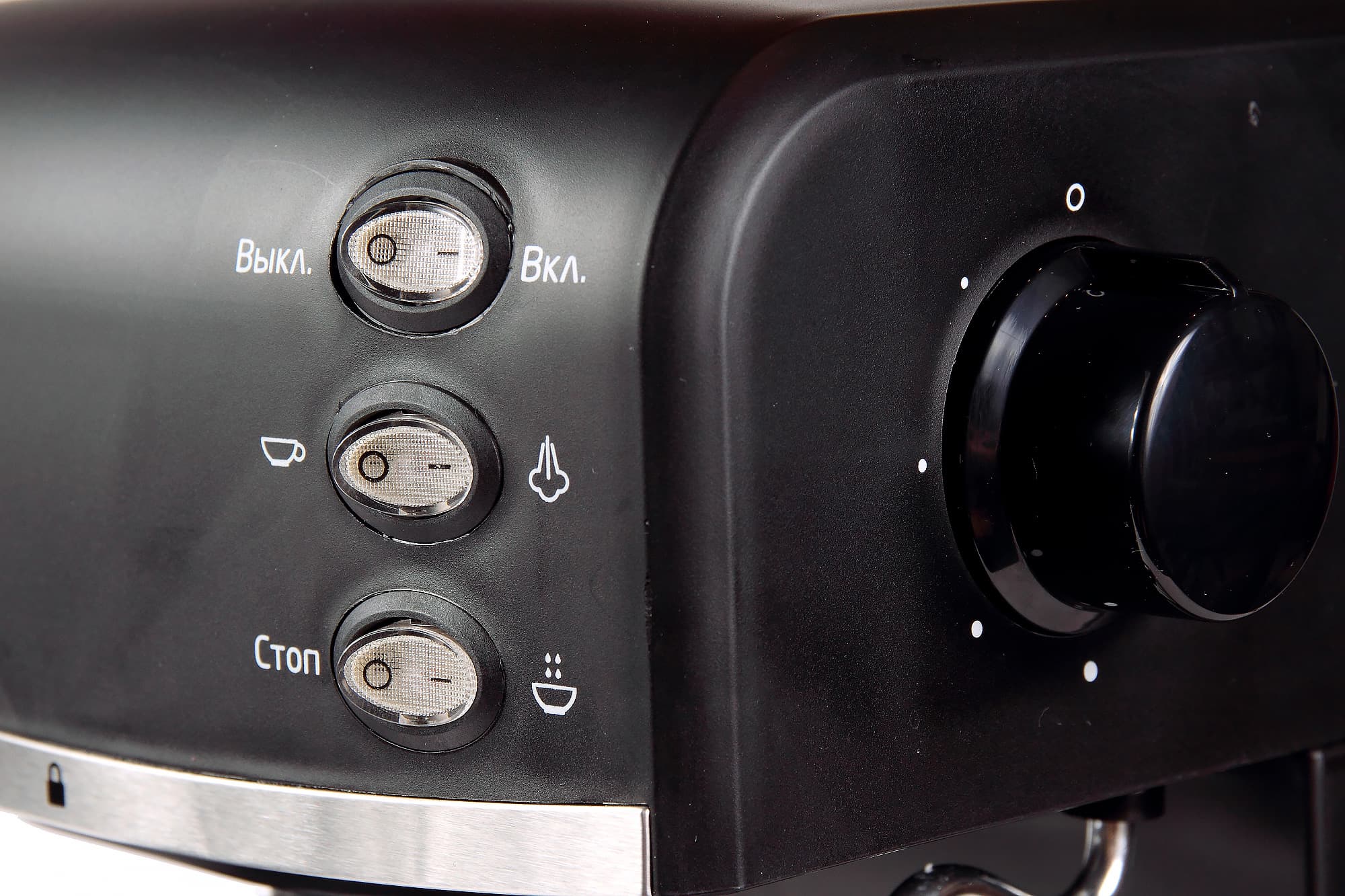 Управление кофеваркой осуществляется с помощью трех механических кнопок-переключателей с неяркой синей светодиодной подсветкой и вращающейся ручки. Звуковых сигналов у кофеварки не предусмотрено.