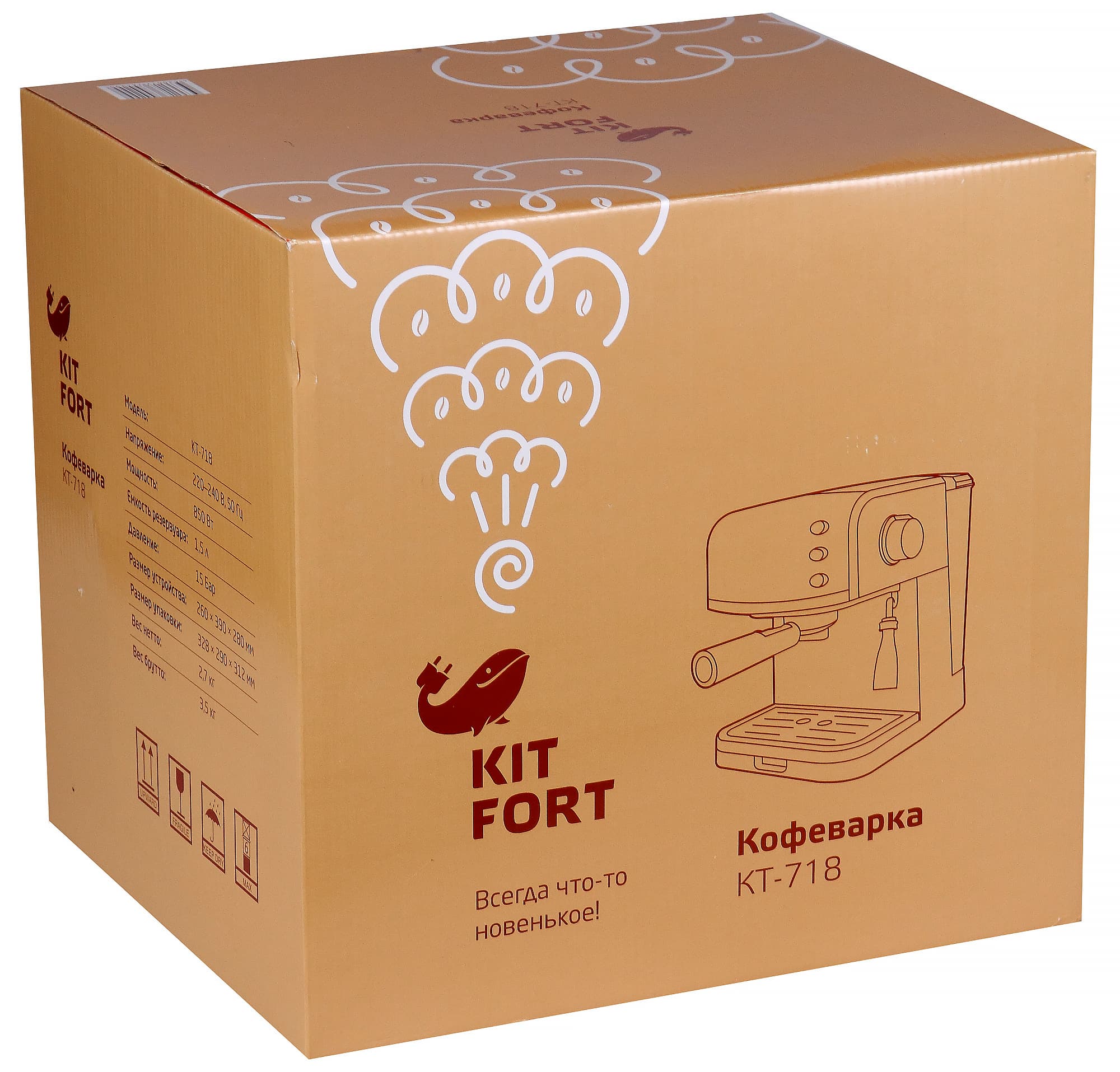Кофеварка поставляется в картонной коробке, оформленной в фирменном стиле Kitfort. Однотонная коробка «кофейного цвета» содержит относительно небольшое количество информации: векторную картинку с изображением самой кофеварки, технические характеристики модели, перечисление основных функций.