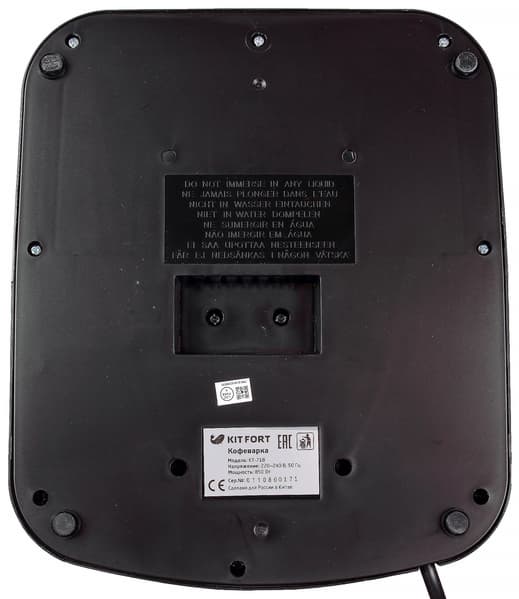Снизу у кофеварки можно обнаружить резиновые ножки и наклейку с номером модели и технической информацией. Отсека для хранения шнура не предусмотрено, поэтому он просто выведен с тыльной стороны прибора. Впрочем, с учетом его небольшой длины (всего 80 сантиметров) вряд ли он будет мешать на столе или рабочей поверхности.
