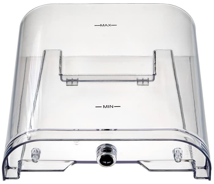 Сзади к корпусу кофеварки крепится емкость для воды из прозрачного пластика. На стенки резервуара нанесена разметка, а сверху его закрывает крышка из такого же прозрачного пластика. Отметки «Min» и «Мах» нанесены на задней стенке резервуара и не видны, если кофеварка стоит задней стенкой вплотную к мебели или стене.