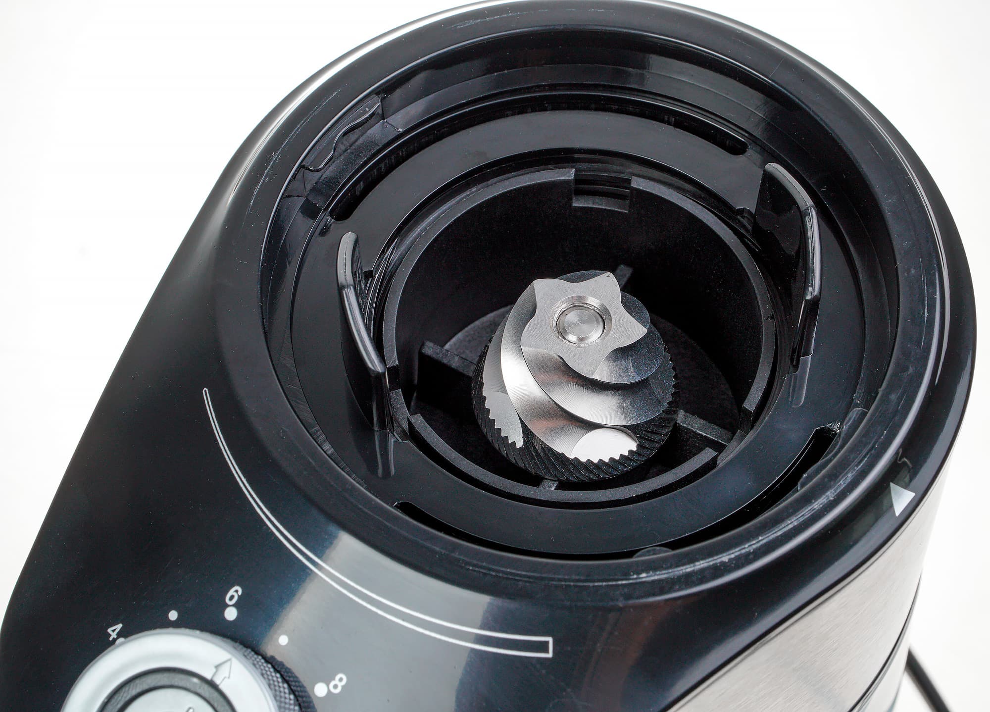 Под контейнером для зерен находятся конические жернова. Как и у прочих подобных кофемолок, вращаться будет нижний конус, тогда как верхний окажется зафиксирован на нужном расстоянии (что обеспечит необходимый размер помола).