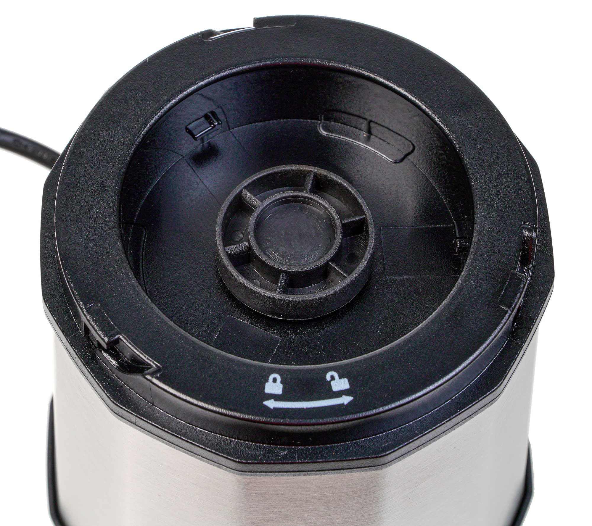 Сверху у кофемолки находится пластиковый разъем для установки чаши — прямо как у «старших братьев» — стационарных блендеров. Для удобства пользователя на корпусе нанесены пиктограммы с изображением открытого и закрытого замка, а также стрелочка, подсказывающая направление фиксации чаши для измельчения.