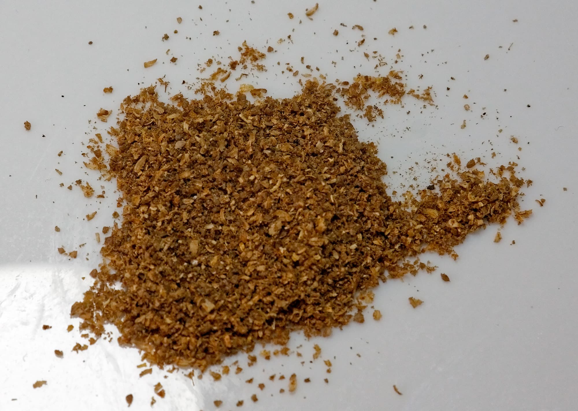 Между запусками хорошо встряхнули прибор. За это время все зернышки (кроме нескольких, оказавшихся на самом дне чаши, под ножами) превратились в кунжутную муку.