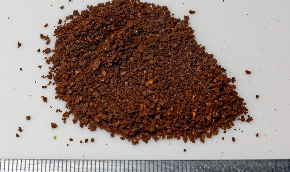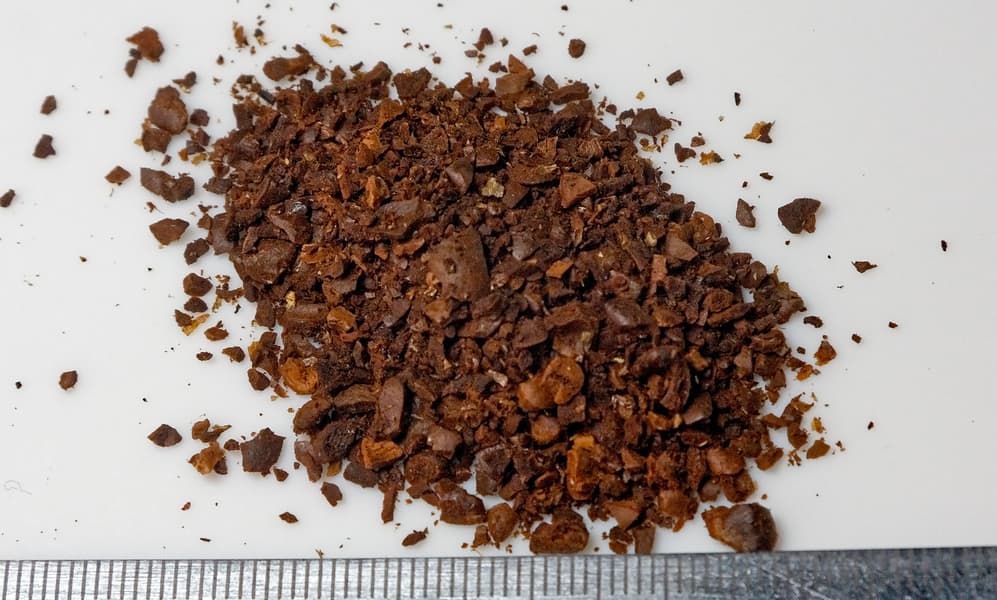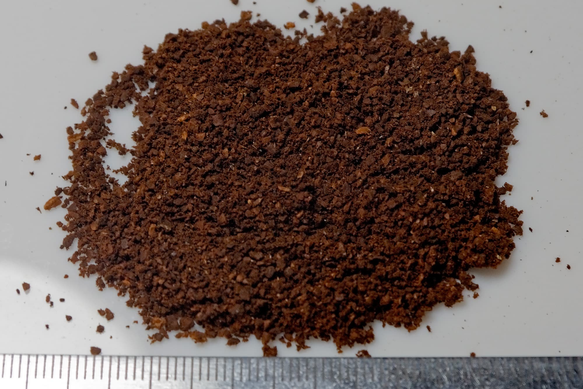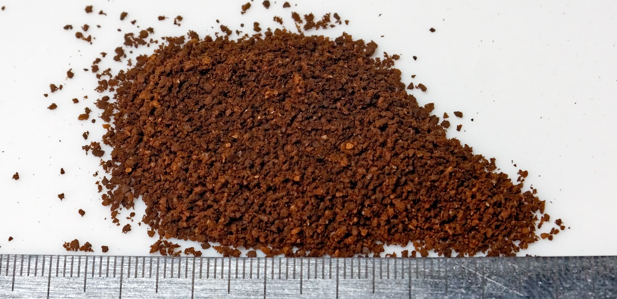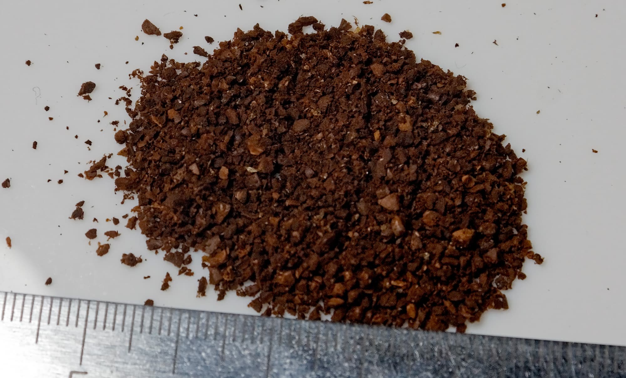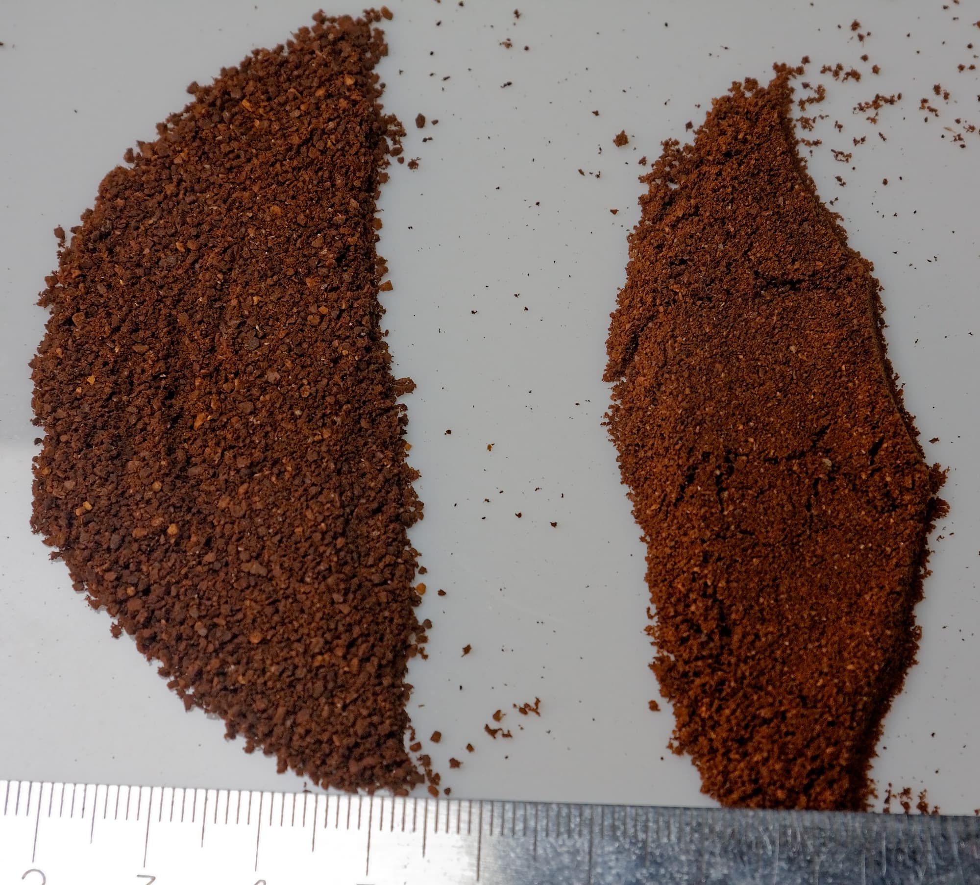 Наша кофемолка при полной загрузке даже за 30 секунд не смолола кофе до уровня, подходящего для приготовления эспрессо (на фото — слева результат работы нашей кофемолки, справа — контрольный помол для эспрессо, выполненный на жерновой кофемолке).