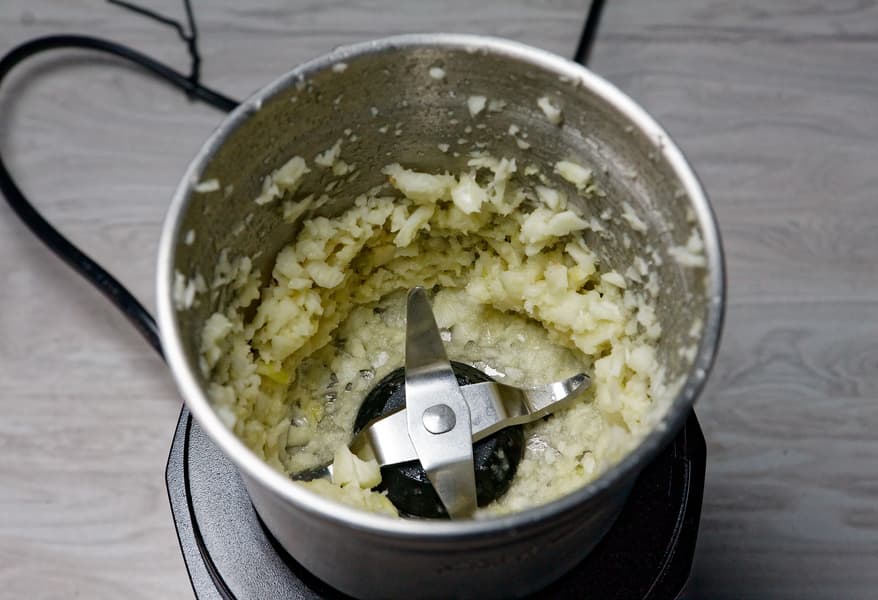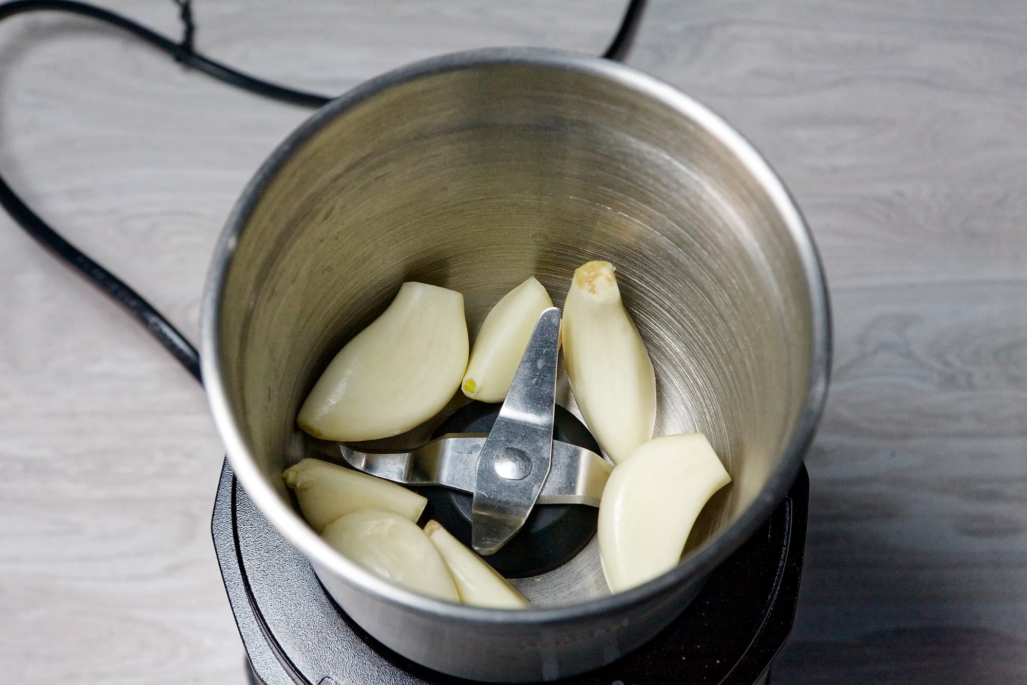 Несколько зубчиков чеснока буквально за несколько секунд превратились в чесночную крошку, прилипшую к стенкам чаши.