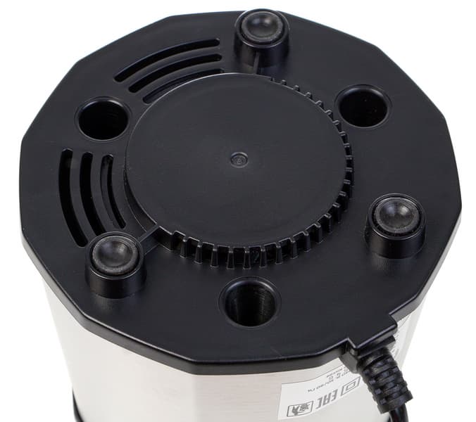С нижней части корпуса находятся резиновые ножки и вентиляционные отверстия. С тыльной стороны размещена наклейка с технической информацией и крепится шнур. Отсека для хранения излишков шнура у кофемолки не предусмотрено.