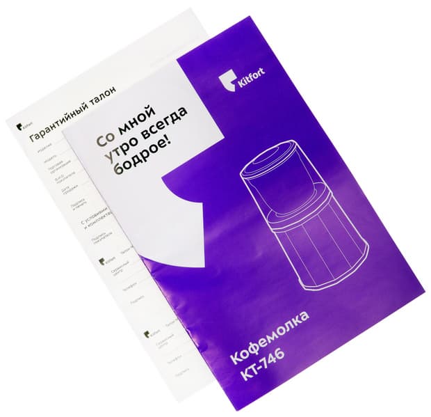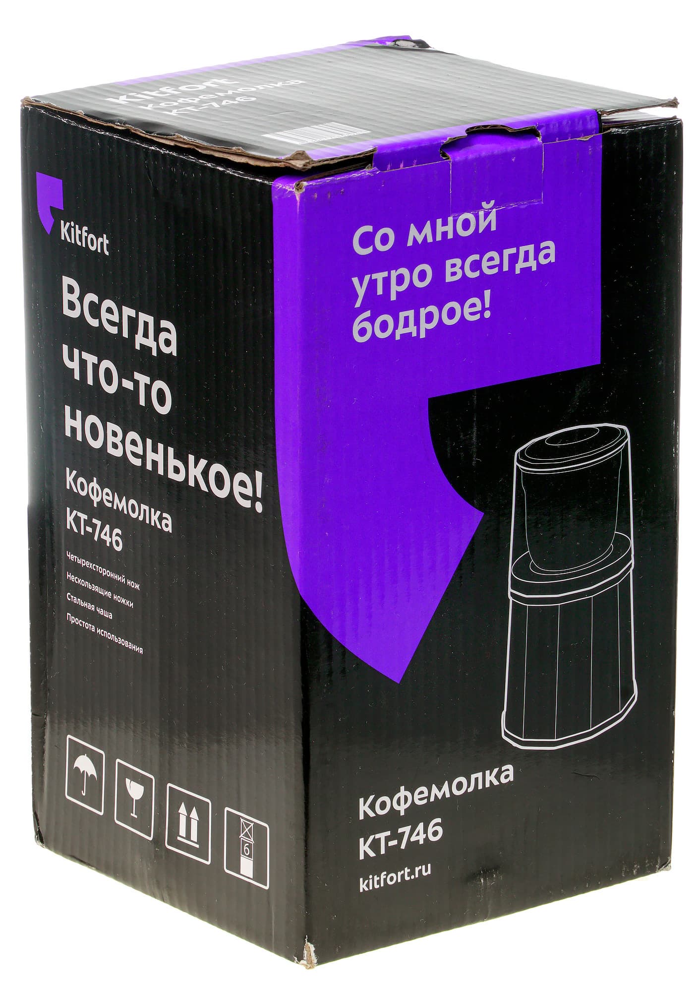 Кофемолка поставляется в коробке, оформленной в фирменной стилистике Kitfort: коробка окрашена в черный и фиолетовый цвета, на боковых гранях можно увидеть векторное изображение прибора, а также описание его основных особенностей и технических характеристик.