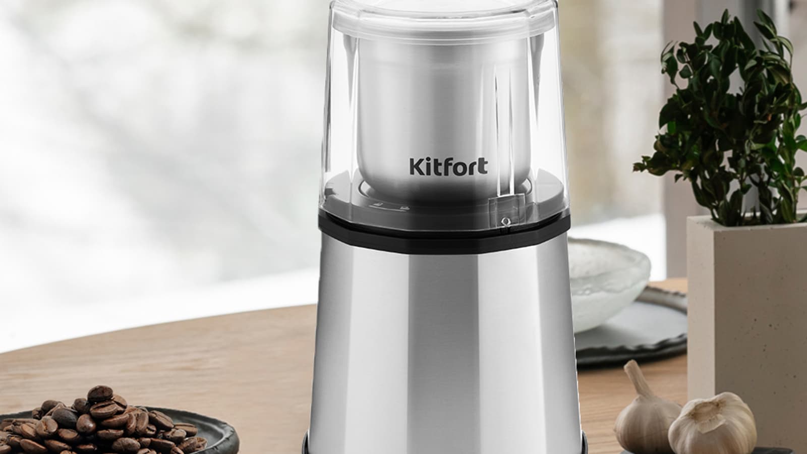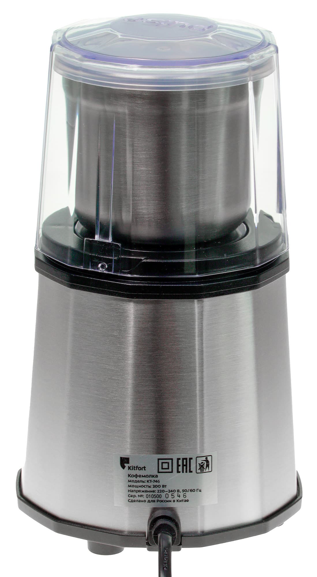 Герой нашего сегодняшнего обзора — кофемолка Kitfort KT-746. Она отличается наличием съемной металлической чаши с ножами, что хоть и привело к некоторому увеличению цены, но должно существенно облегчить процесс ухода за прибором (очистку чаши от остатков кофе или молотых специй).