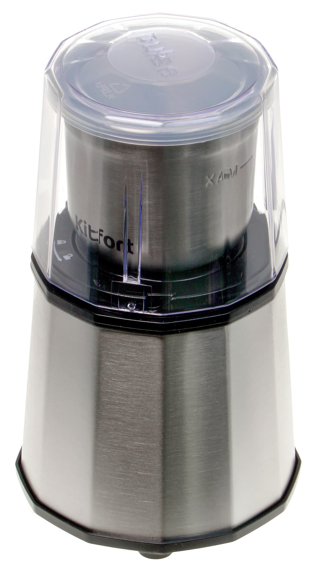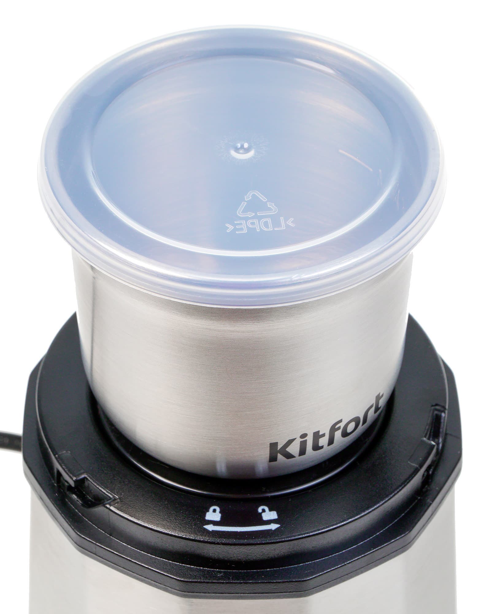 Кофемолка Kitfort KT-746 по своей конструкции скорее напоминает мини-блендер, чем обычную ножевую кофемолку: она оснащена съемной чашей и четырехлопастным ножом (а не двухлопастным, как обычно принято у ножевых кофемолок).