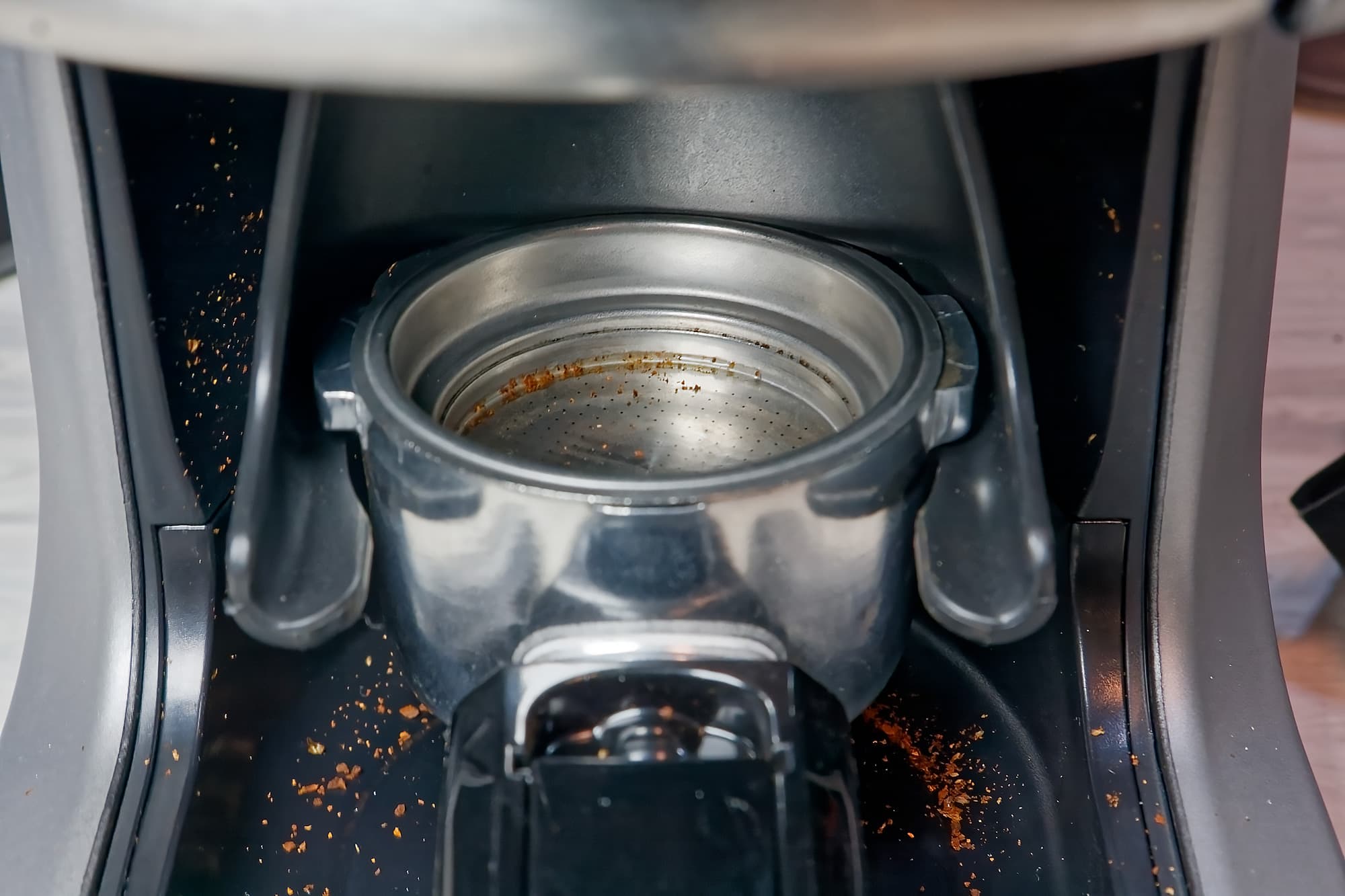Спереди — место для установки съемного лотка/бункера для молотого кофе/насадок для рожков и утопленная кнопка помола в рожок.