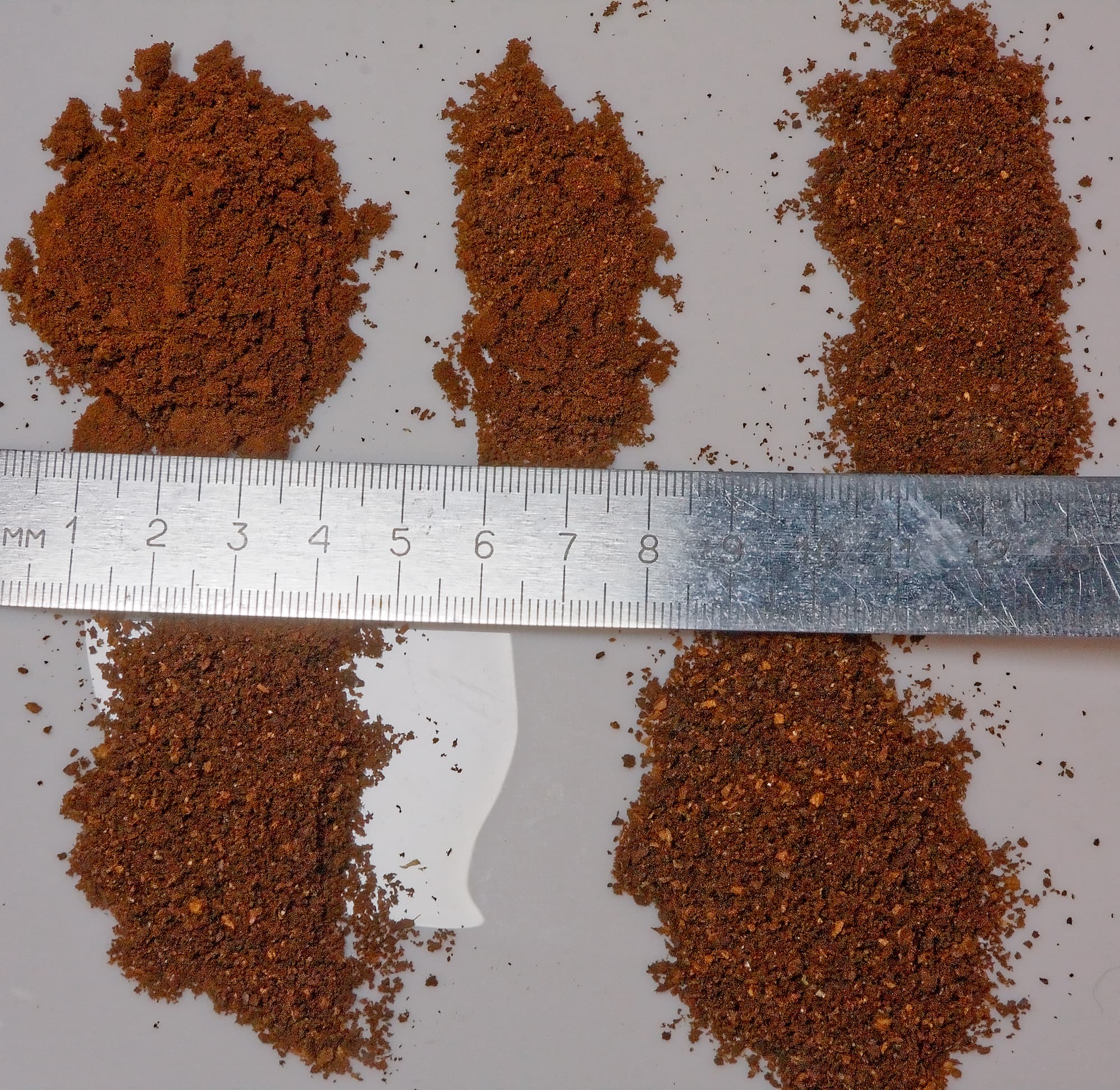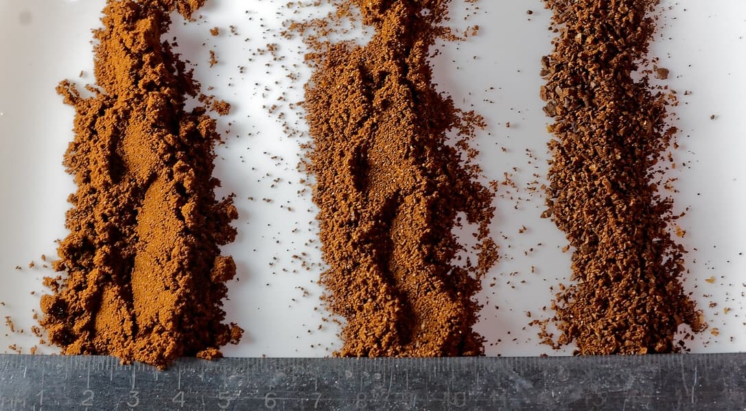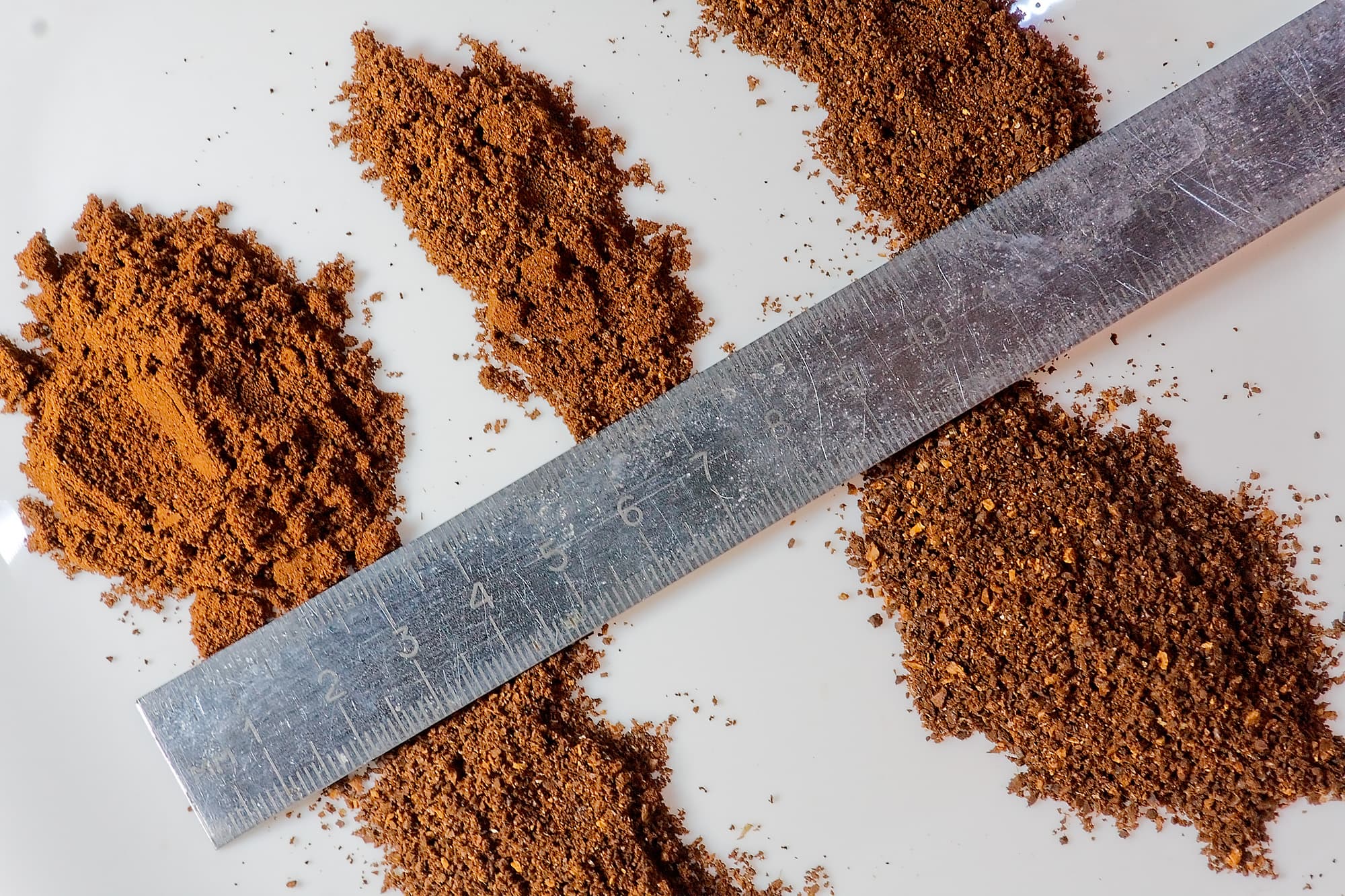 Наконец, сравним минимальный помол (слева), максимальный (справа) и эталонный эспрессо-помол (по центру), который мы смололи с помощью кофеварки Lelit Anita (со встроенной кофемолкой примерно соответствующей по уровню Lelit PL43).