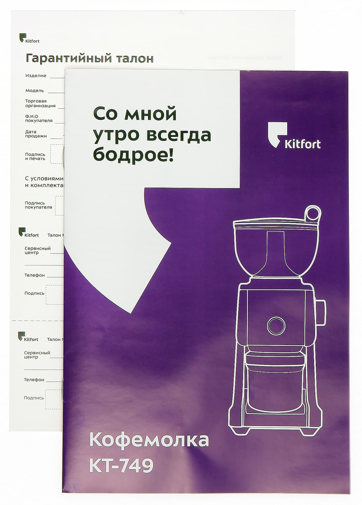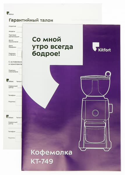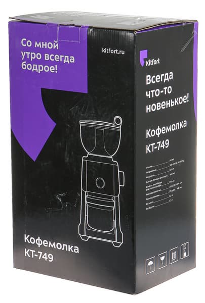 Кофемолка поставляется в картонной коробке, оформленной в фирменном стиле Kitfort: сочетание черного и фиолетового цвета, векторное изображение прибора, краткое описание его основных характеристик и особенностей, а также слоган — «Со мной утро всегда бодрое!»
