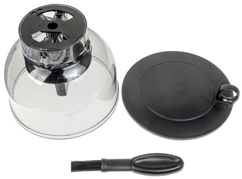 Бункер для зерен сделан из прозрачного затемненного пластика. Он устанавливается сверху на корпус кофемолки и фиксируется поворотом пластиковой ручки, расположенной внутри бункера. Крышка бункера для зерен сделана из черного матового пластика и оснащена специальной ручкой-кольцом. Объем бункера для зерен — 400 мл.