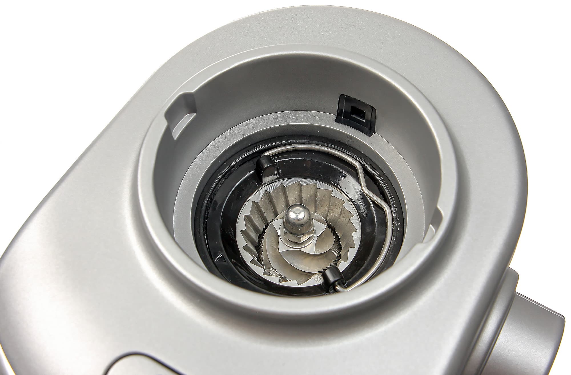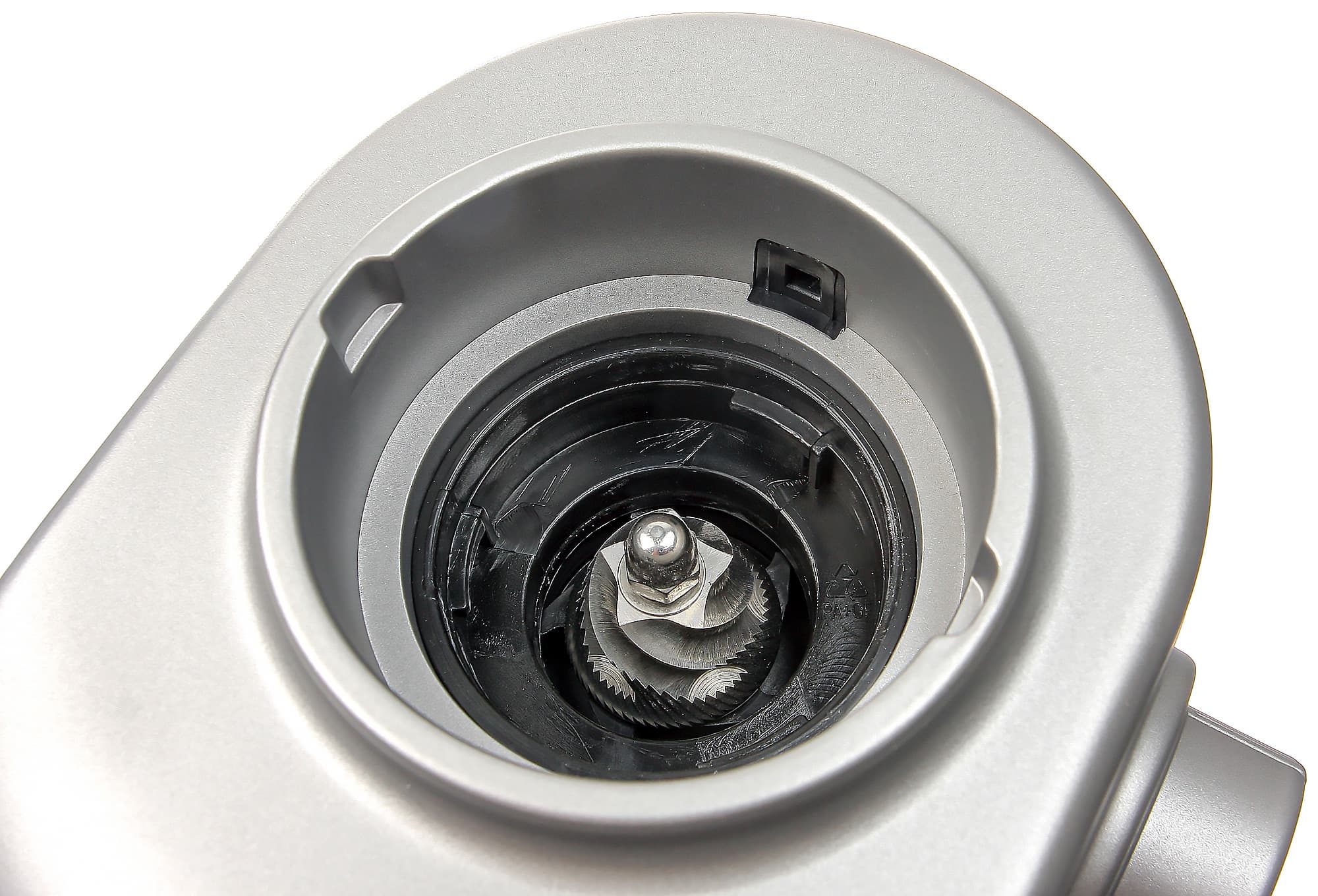 Вращение ручки отвечает за высоту верхнего (съемного) жернова, который смещается относительно центрального (неподвижного), тем самым регулируя желаемую степень помола.
