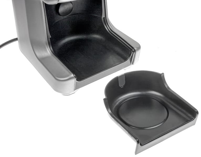 Пластиковый лоток и бункер для молотого кофе фиксируются с помощью магнитов, насадки для рожков — надеваются на выходное отверстие кофемолки.