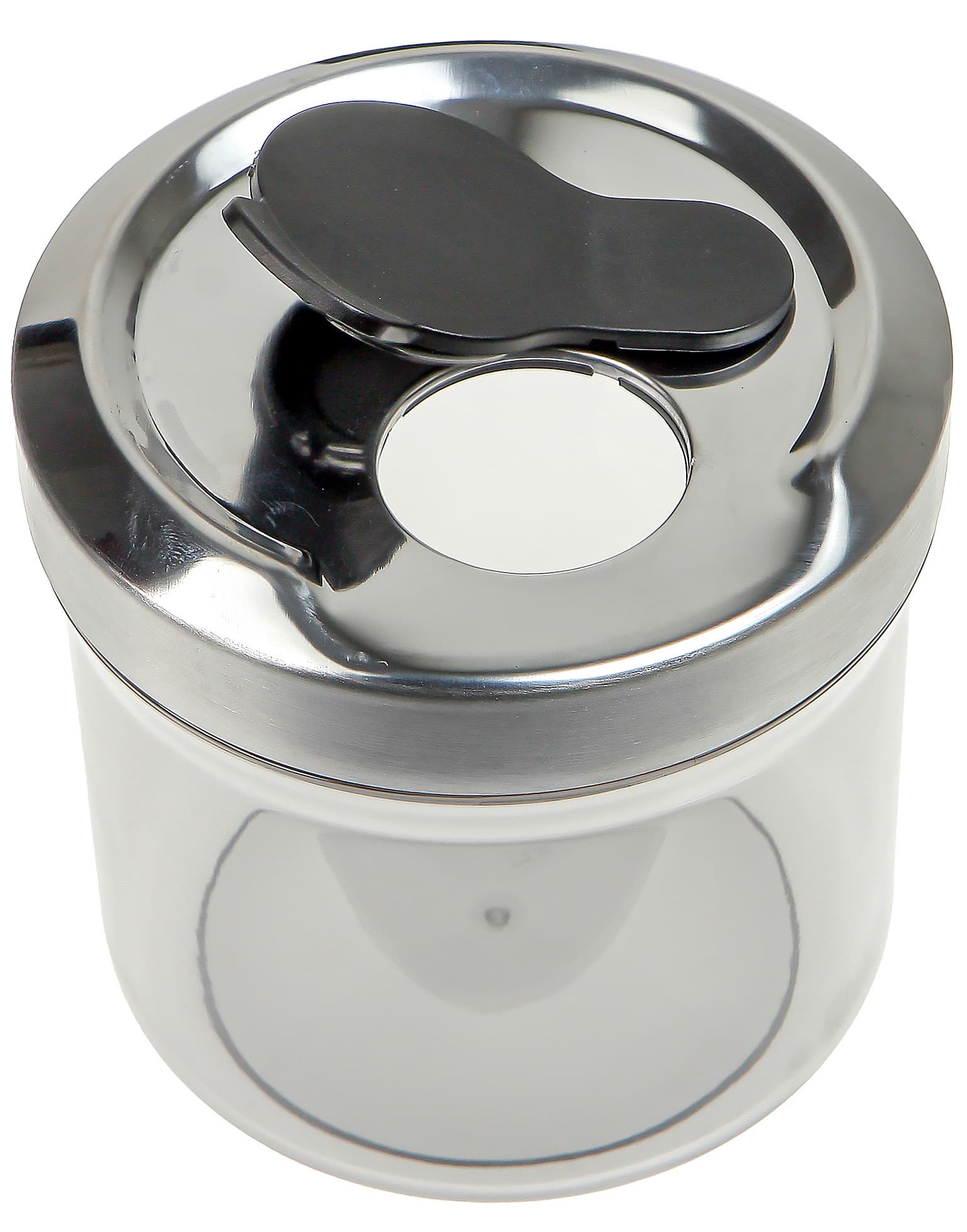 Контейнер для молотого кофе объемом 240 мл также сделан из прозрачного затемненного пластика. У контейнера имеется металлическая винтовая крышка, а у крышки, в свою очередь, предусмотрено отверстие с пластиковой пробкой. Благодаря этому контейнер с молотым кофе можно использовать в качестве герметичной банки для хранения молотого кофе.