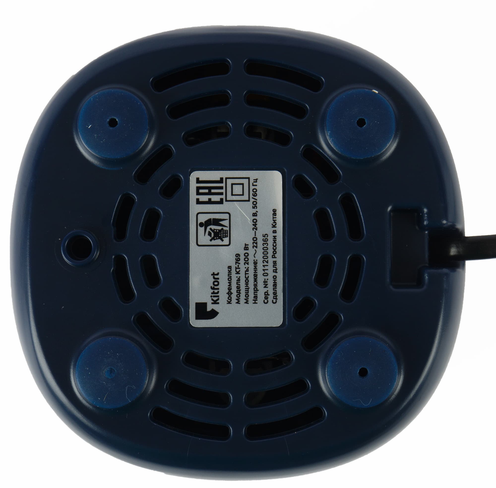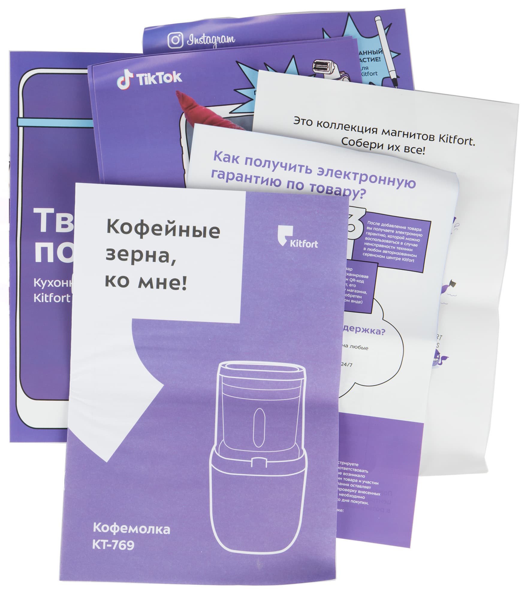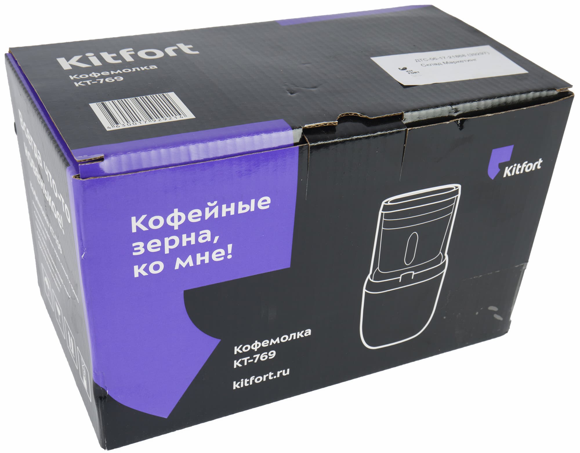 KT-769 поставляется в картонной коробке, оформленной в фирменной стилистике Kitfort. Прибор защищен от ударов с помощью пенопластовых вкладок и полиэтиленовых пакетов. На лицевой грани — векторное изображение прибора и слоган «Кофейные зерна, ко мне!», настраивающий на бодрость и хорошее настроение. На боковых гранях приведены некоторые технические характеристики.