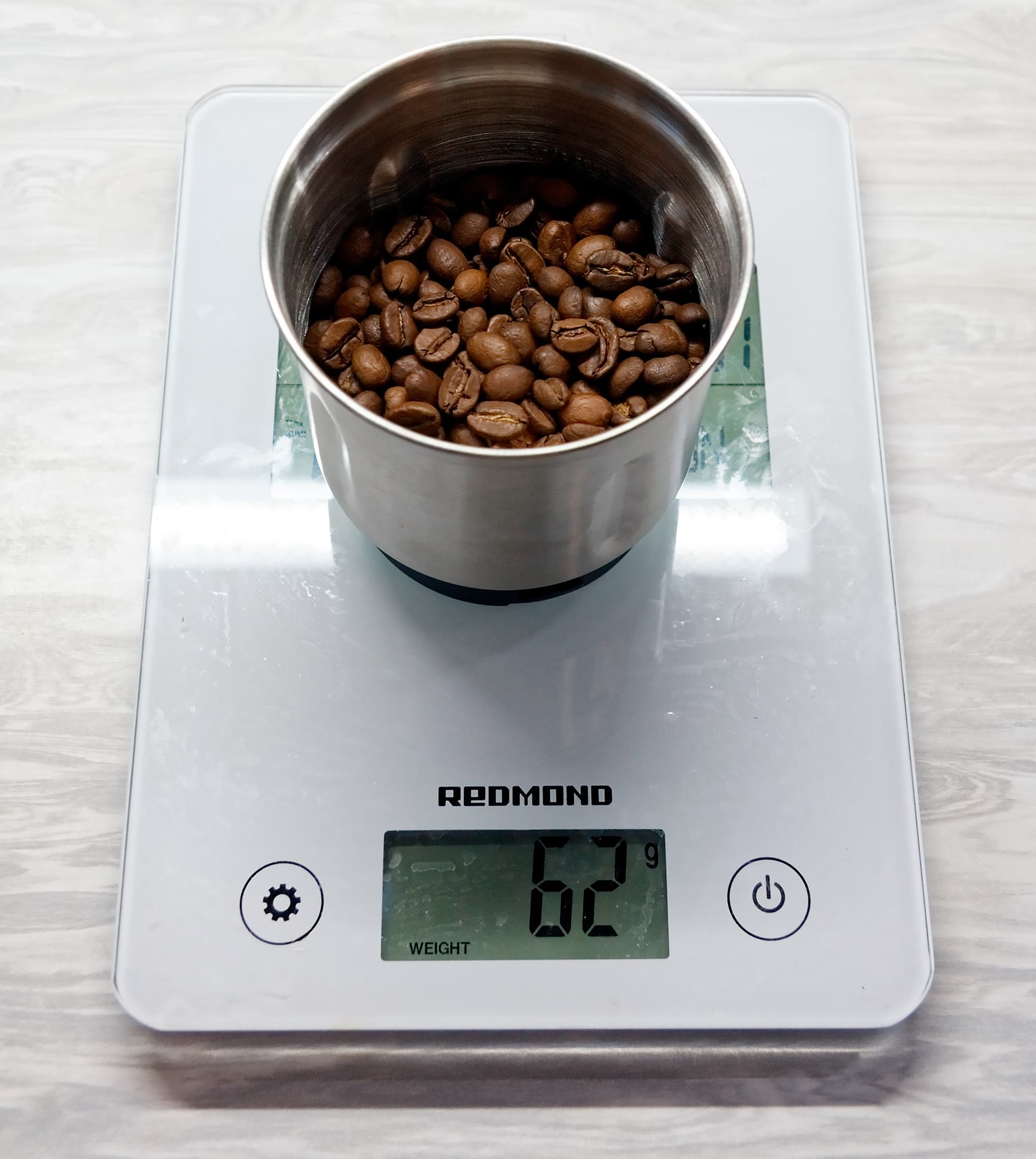 Для начала мы наполнили емкость кофемолки до отметки Max и провели контрольное взвешивание. 60 граммов — в точности как заявлено производителем!