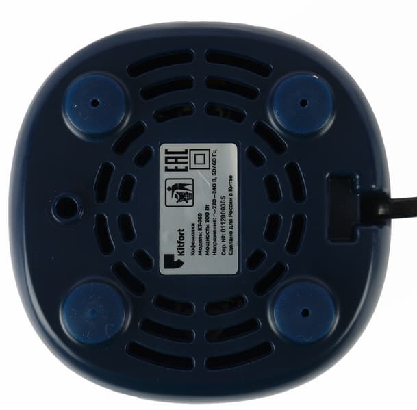 С нижней стороны мы видим вентиляционные отверстия, четыре резиновых ножки (тоже синие — производитель подумал о внешнем виде даже тех элементов, которые не будут видны во время работы), а также шильдик с номером модели и технической информацией.