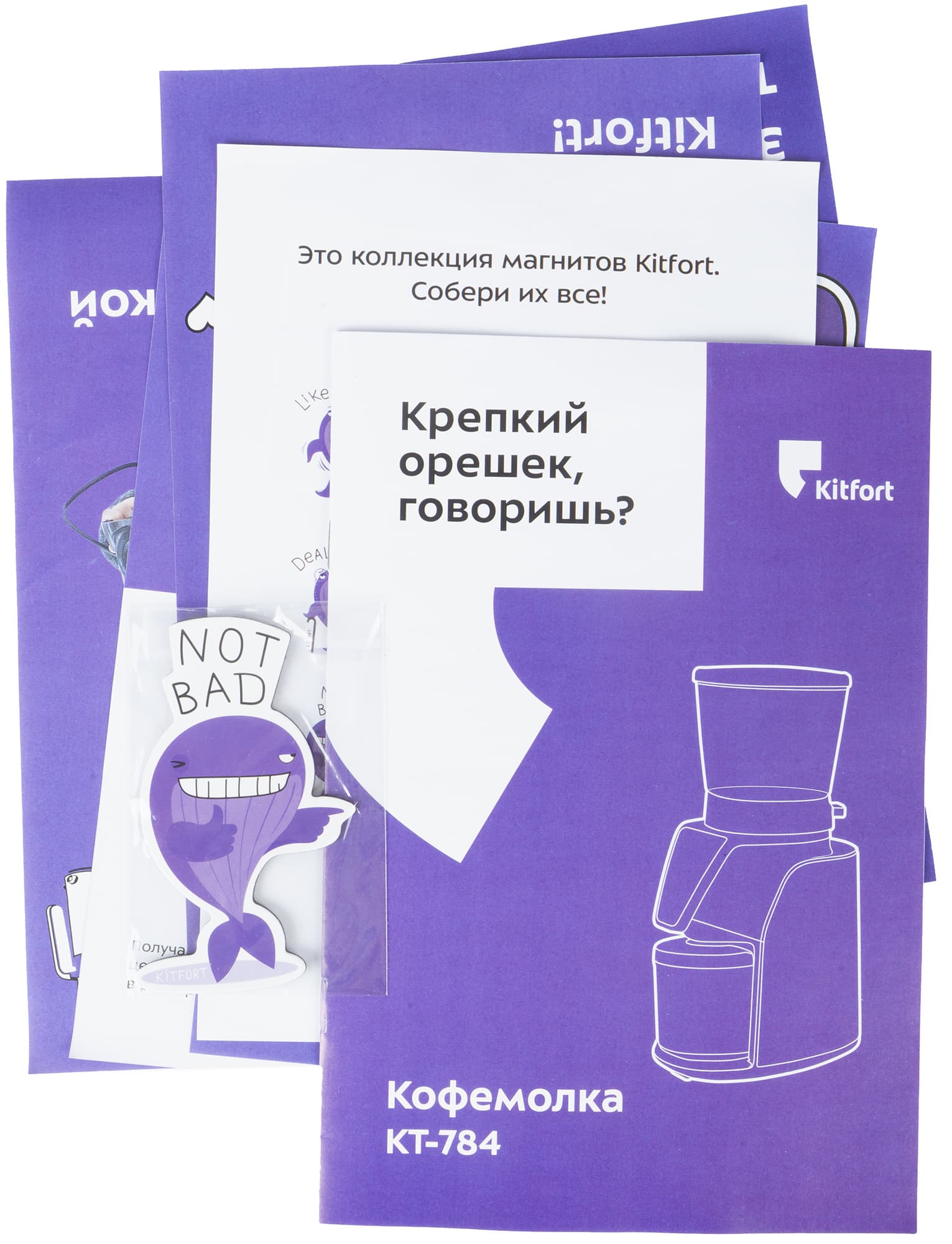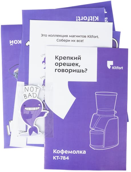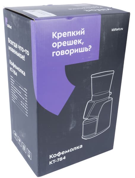 Кофемолка поставляется в картонной коробке, оформленной в фирменном стиле Kitfort: сочетание черного и фиолетового цвета, векторное изображение прибора, краткое описание его основных характеристик и особенностей, а также слоган — «Крепкий орешек, говоришь?». Несколько странный, на наш взгляд, выбор. Орехи и прочие твердые продукты в кофемолке молоть нельзя. Только кофейные зерна!