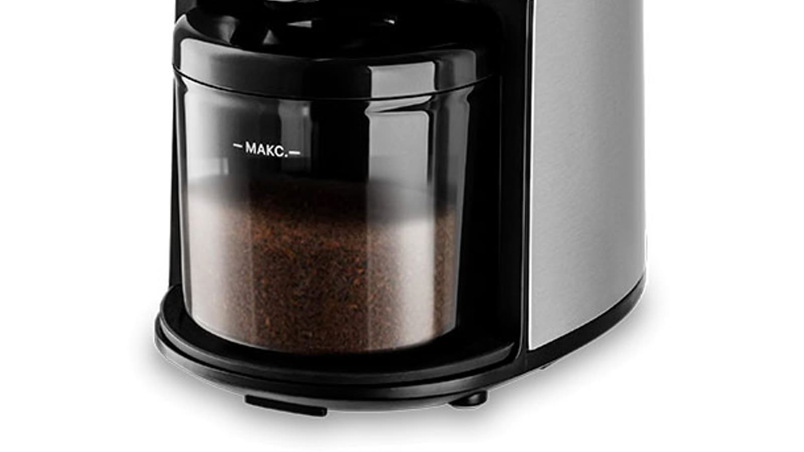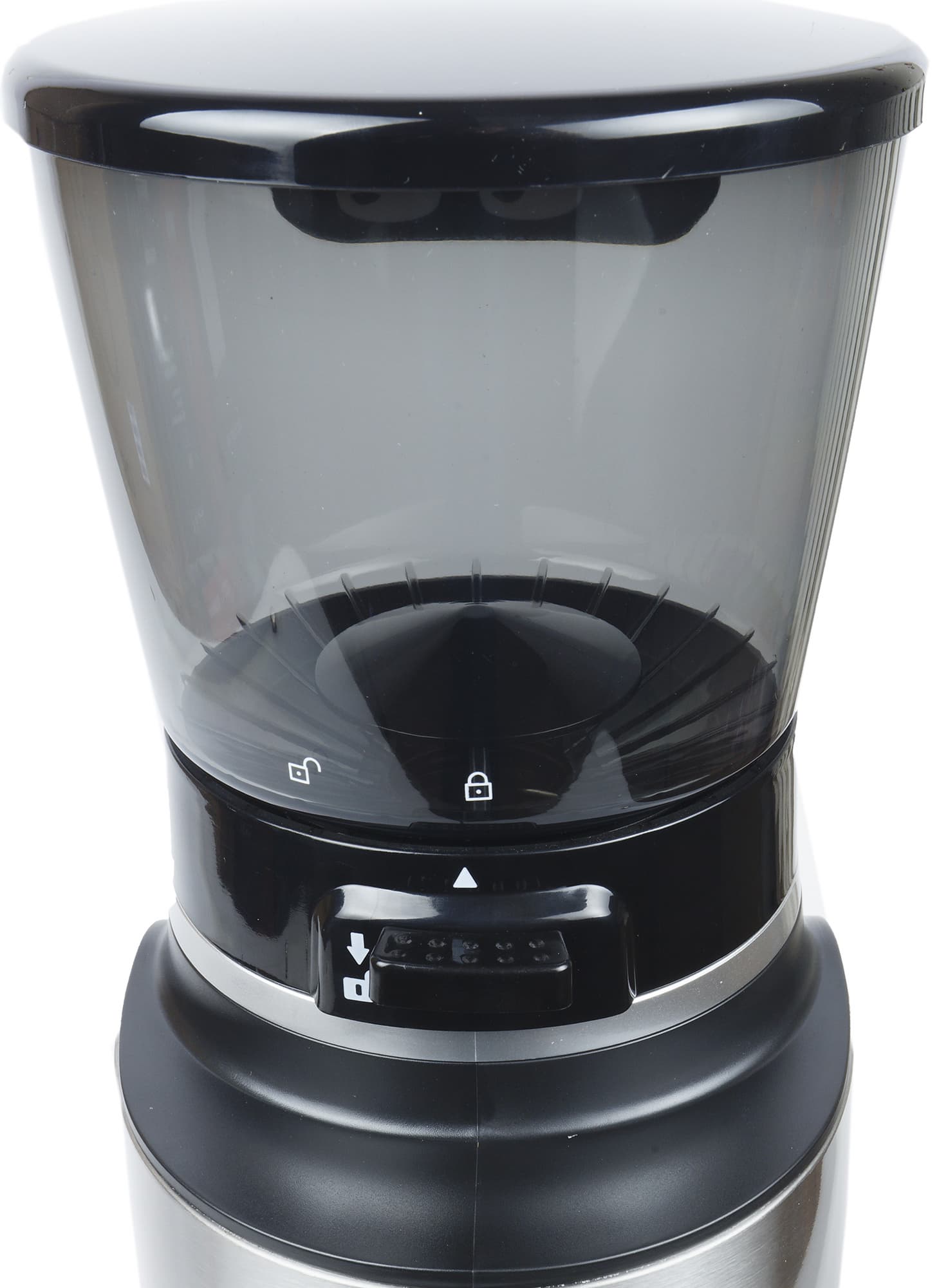 Бункер для зерен также сделан из прозрачного затемненного пластика. Он устанавливается сверху на корпус кофемолки и фиксируется поворотом на несколько градусов.