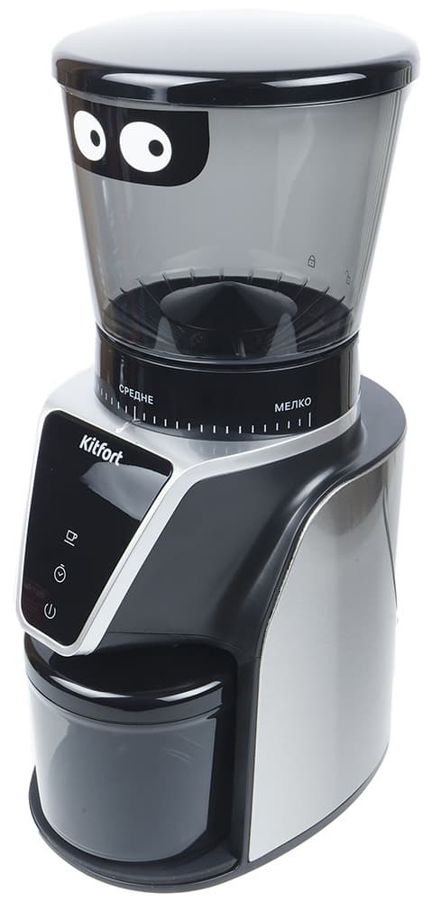 При знакомстве кофемолка производит исключительно положительное впечатление. Сразу же отметим стильно выглядящий корпус, а также не менее стильную панель управления с сенсорными кнопками. Немного несерьезности добавляет наклейка с глазками (если вам начнет казаться, что кофемолка за вами следит, наклейку можно без труда отклеить).