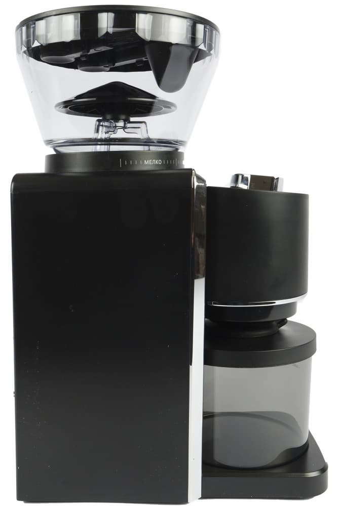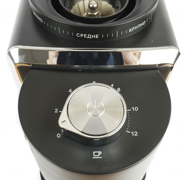 Все надписи на приборе нанесены на русском языке. Так, нарисованная шкала регулятора под чашей для зерен указывает на режимы «мелко», «средне», «крупно». Речь идет о степени помола. Самая тонкая — «в пыль» для турки, крупный — для варки в френч-прессе. В инструкции производителя не указано точное число степеней, рисок на шкале 21. Регулируются степени по щелчкам. На тонком помоле переход от совсем «в пыль» до менее плотного состояния лучше заметен визуально.