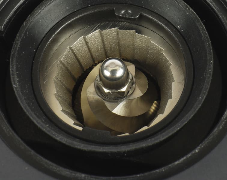 Под ним, по центру расположено углубление для металлических конических жерновов. Верхний съемный, обрамленный пластиком и резиновой прокладкой легко вынимается и чистится. Нижний жернов неподвижный. Он прочно зафиксирован и не должен демонтироваться. Оба жернова сделаны из стали, внешний конус остается неподвижным, внутренний вращается. Диаметр равен 40 мм.