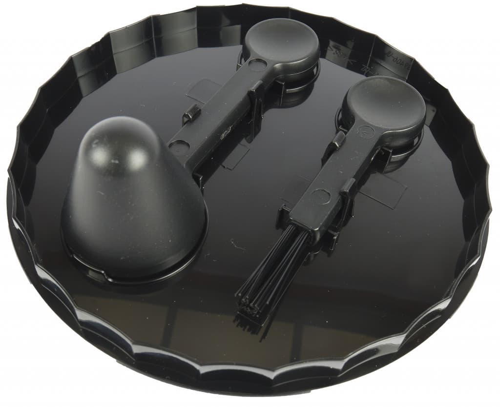 Бункер для зерен сделан также из прозрачного пластика, он устанавливается сверху на моторный блок кофемолки. Для этого уже указанную стрелочку (белый штрих углом вниз) устанавливаем вровень с значком на регуляторе, затем емкость слегка поворачиваем по часовой стрелке. В итоге белая стрелка контейнера для зерен встанет над шкалой типов помола. Закрывается емкость черной, пластиковой крышкой, под которой в нерабочем состоянии хранятся щетка и мерная ложка. Снимается конструкция тем же способом, поворотом против часовой стрелки. Объема бункера хватает для частого домашнего использования.