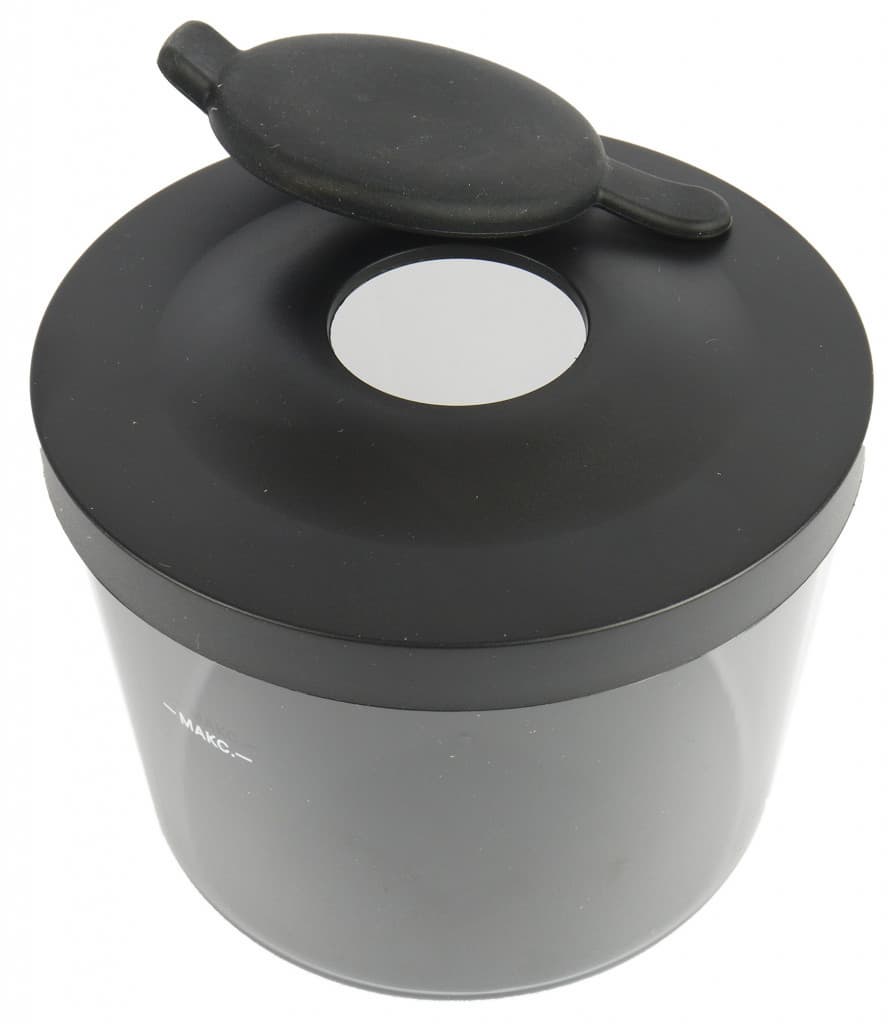 Контейнер для молотого кофе вмещает до 130 граммов молотого кофе. Отметка max на корпусе отмеряет уровень приблизительно в 100 граммов. Выполнена емкость из прозрачного затемненного пластика. Сверху установлена пластиковая крышка, а у крышки, в свою очередь, предусмотрено отверстие для молотого кофе. Отверстие закрыто резиновой, герметичной заглушкой. Это позволяет после помола спокойно хранить остатки непосредственно в емкости.