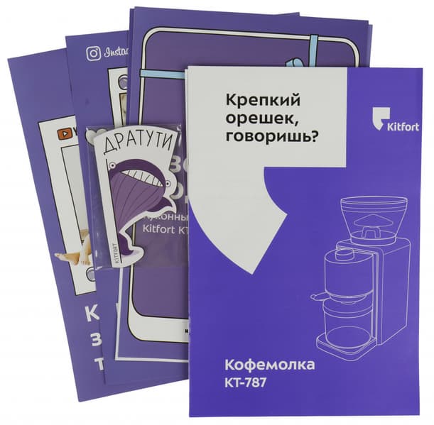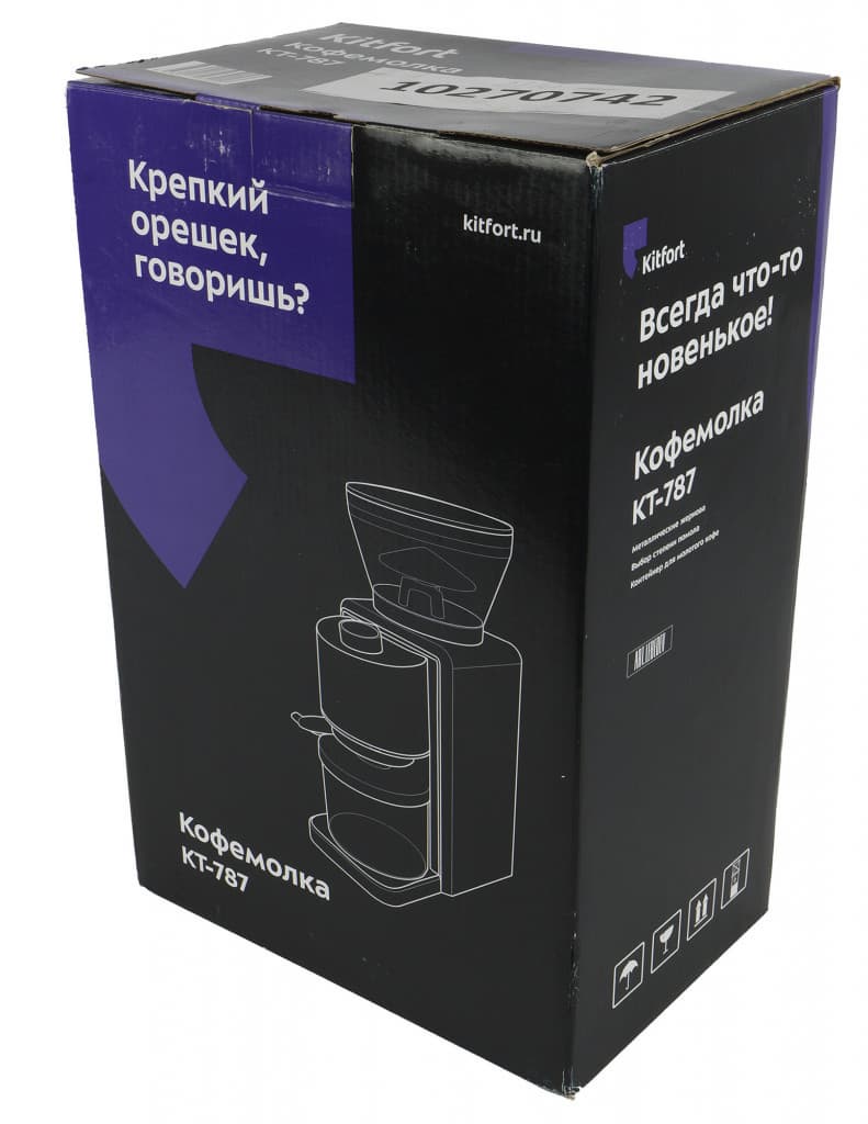 Слоган упаковки рассмешил: «Крепкий орешек, говоришь?» На всякий случай напомним: это жерновая кофемолка, ее нельзя использовать для помола орехов. Кофемолка поставляется в традиционной картонной коробке в фирменном стиле Kitfort. Перед нами узнаваемое сочетание черного и фиолетового цвета, схематичное изображение прибора, краткое описание основных характеристик и особенностей. «Всегда что-то новенькое!» — обещает реклама на одной из стенок.