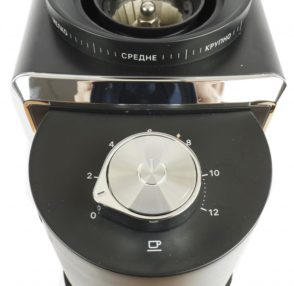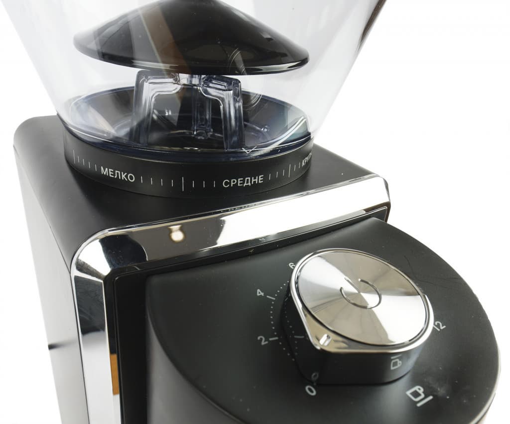 Регулировка помола осуществляется вращением контейнера с зерном, количество молотого кофе — выставленным таймером. Таймер измеряет время помола в условных чашках эспрессо: чем больше чашек вы выбираете, тем дольше будут перемалываться зерна.