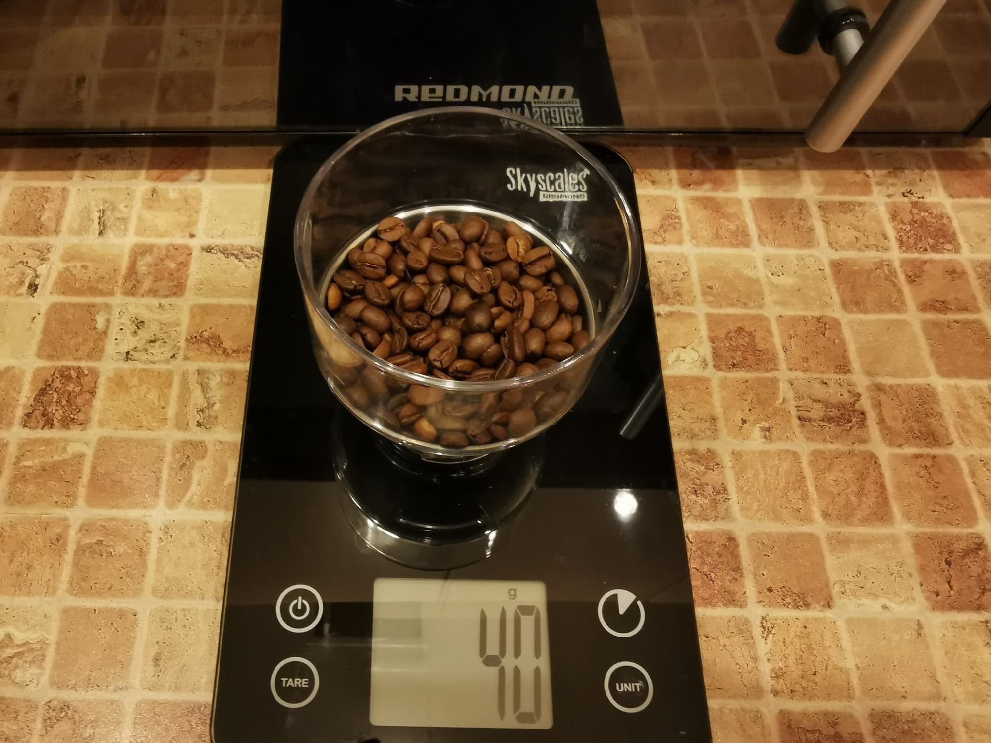 Для начала мы наполнили емкость кофемолки до края части чаши, выполненной из нержавеющей стали и провели контрольное взвешивание. 40 граммов — в точности как заявлено производителем.