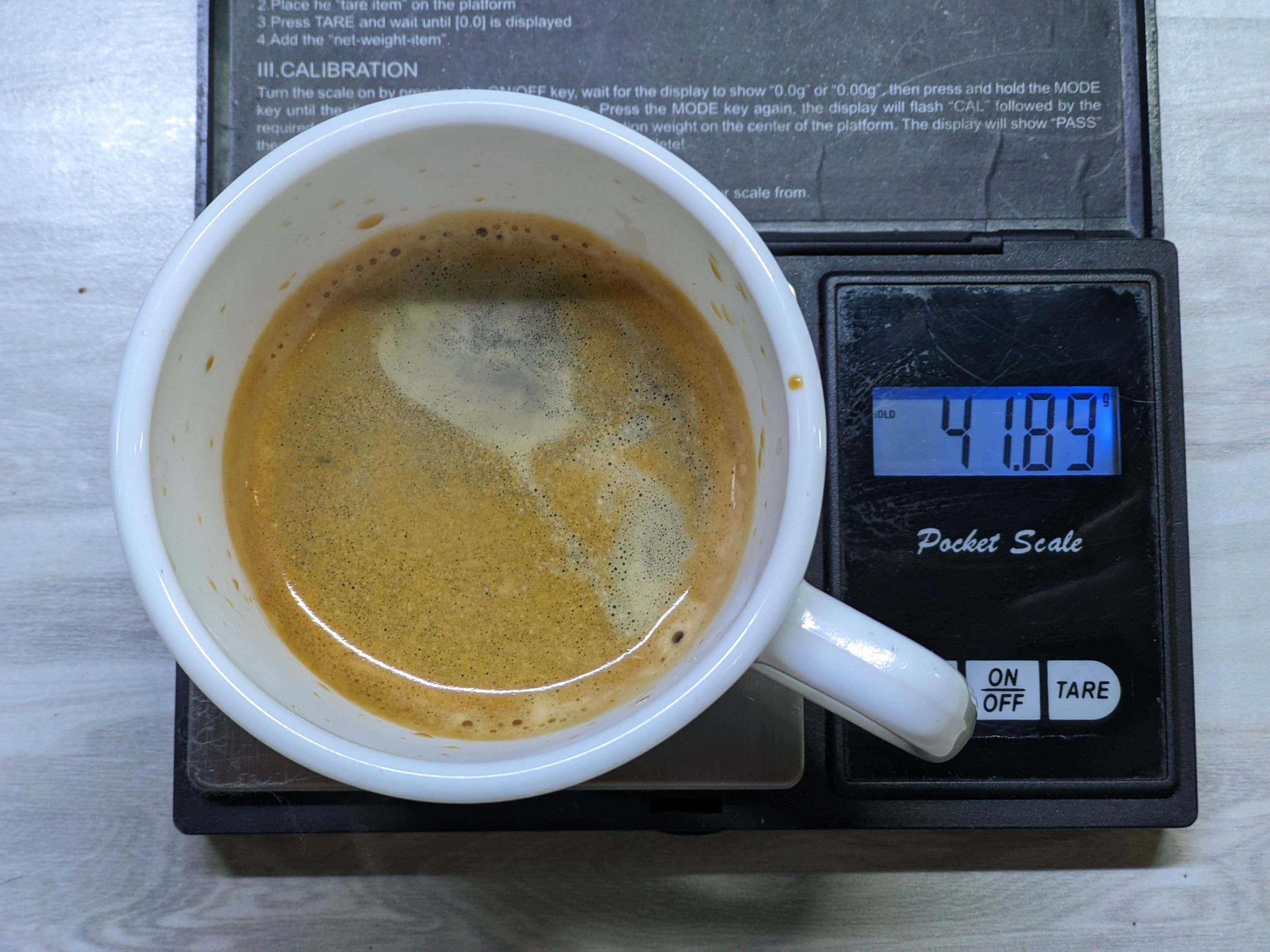 Одинарный эспрессо у нас получился весом без малого 42 грамма (при закладке кофе 9,5 граммов), температура в непрогретой чашке составила 65 °C.