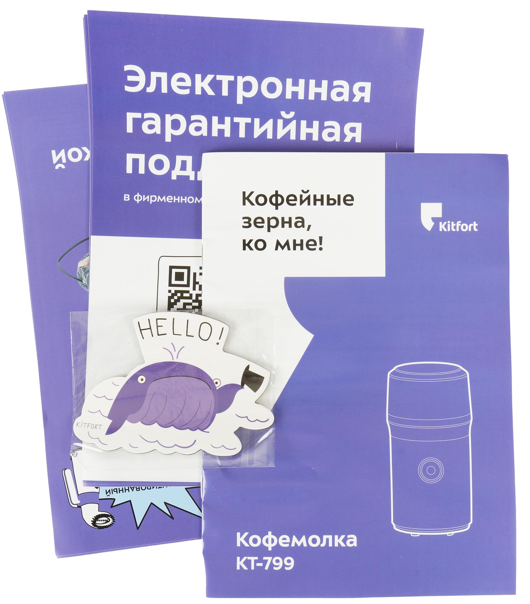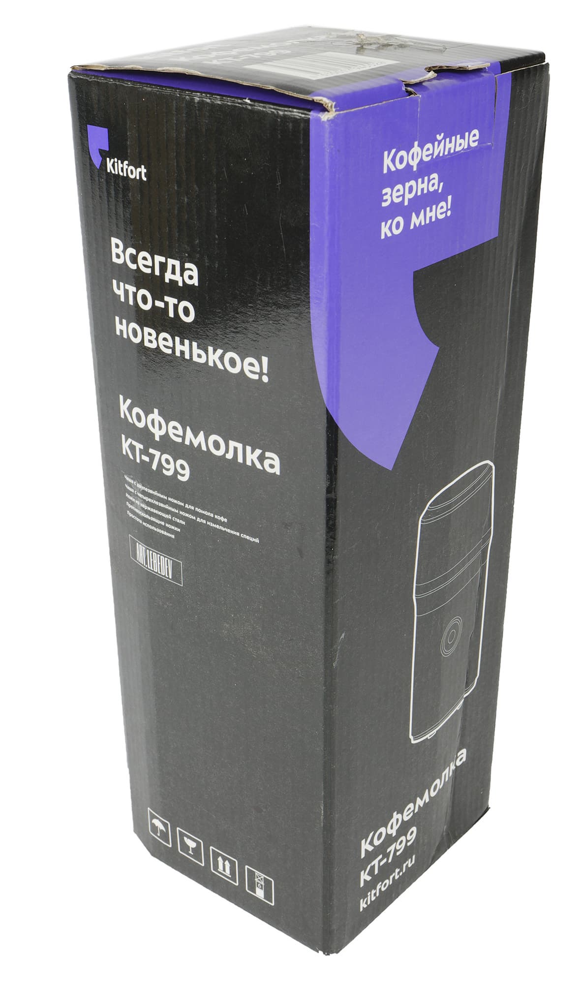Кофемолка KT-799 поставляется в небольшой картонной коробке в форме параллелепипеда, оформленной в фирменной стилистике Kitfort. На лицевой грани — векторное изображение прибора и слоган «Кофейные зерна, ко мне!», настраивающий на бодрость и хорошее настроение. На боковых гранях приведены некоторые технические характеристики.
