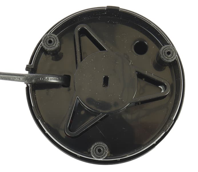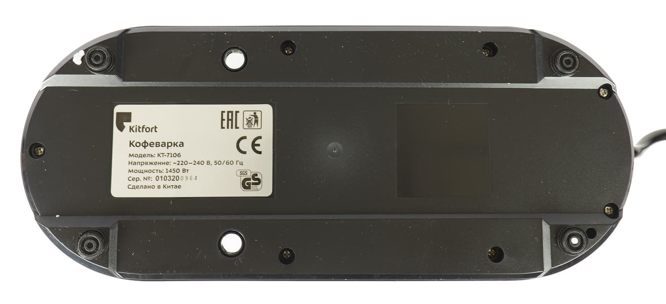 Снизу у нашей кофеварки нет ничего примечательного. Тут мы видим наклейку с технической информацией, а также резиновые ножки, препятствующие скольжению устройства по рабочей поверхности.