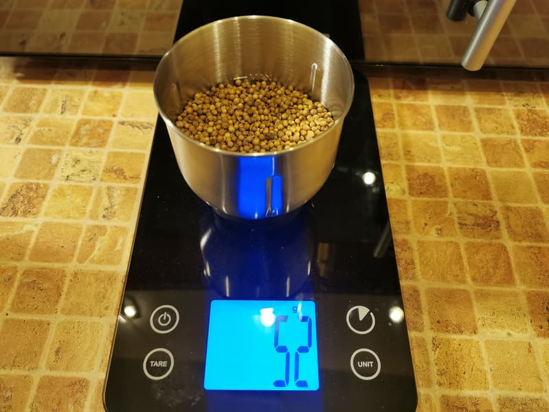 В качестве тестового материала взяли зерна кориандра. Наполнили чашу для специй кориандром до отметки Max и также провели контрольное взвешивание. Получилось 52 грамма — на 18 граммов меньше, чем заявлено у производителя.