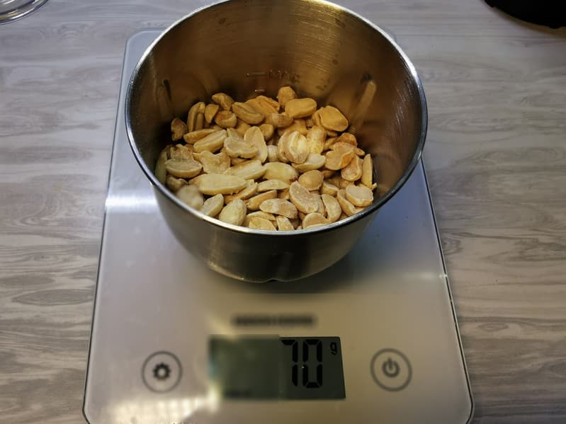 Кориандр — достаточно легкая специя, поэтому мы также провели контрольное взвешивание с арахисом. Он относится к твердым продуктам, поэтому его можно класть только до нижней отметки. Получилось ровно 70 граммов — как и заявил производитель.