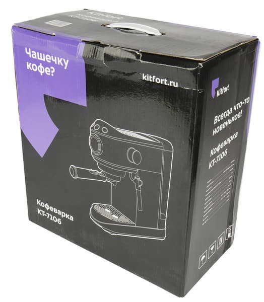 Кофеварка KT-7106 приехала к нам в черной прямоугольной картонной коробке средних размеров, оформленной в фирменной стилистике Kitfort. На лицевой грани — наименование сайта производителя, устройства и его модели, векторное изображение прибора и завлекающий слоган «Чашечку кофе?». На боковых гранях приведены некоторые технические характеристики.