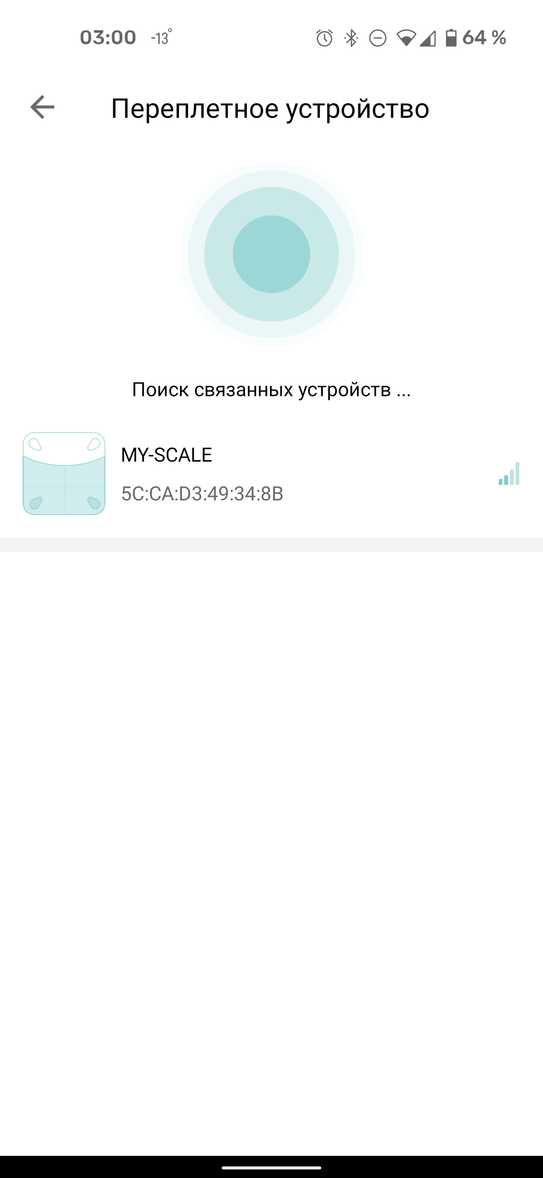Включенные весы определяются приложением автоматически, но при необходимости можно провести и ручной поиск (забавно, что найденный прибор в приложении называется «переплетное устройство» — гримасы машинного перевода).