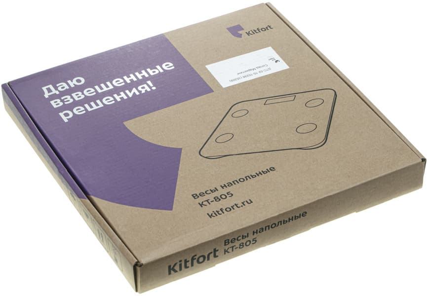 Прибор упакован в плоскую коробку из коричневого картона. На ее лицевой стороне можно видеть векторное изображение устройства, логотип производителя, название модели и фирменную особенность Kitfort — слоган, подбираемый маркетологами компании для каждой из групп бытовой техники. Для напольных весов в Kitfort выбрали уверенное «Даю взвешенные решения».