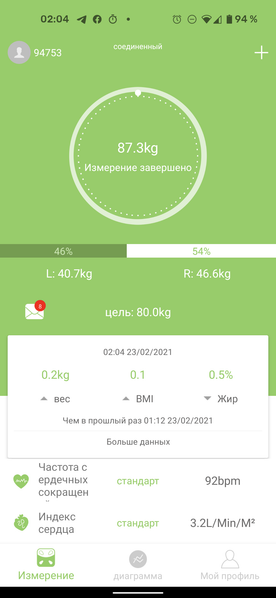 После этого пользователь может покинуть платформу весов — они автоматически выключатся через десять секунд. На главном экране приложения в этот момент появляются свежие результаты измерений.