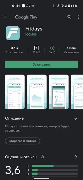 Для работы с весами Kitfort KT-808 производитель рекомендует Fitdays компании Icomon (на момент написания обзора более 1 млн установок, средняя оценка 3,6).